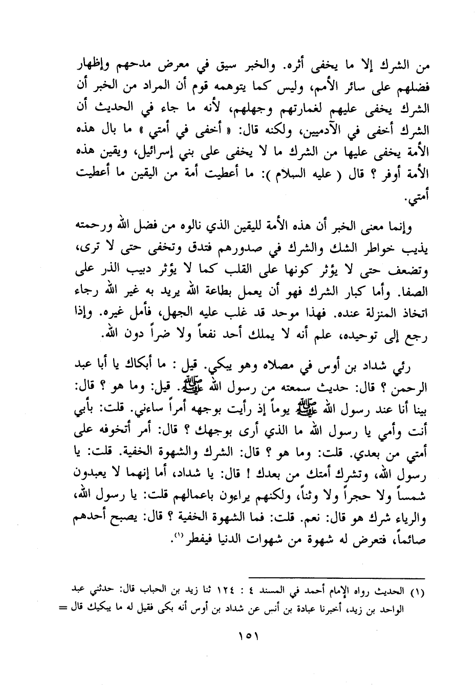 رئي شَدَّاد بن أَوْس فِي مُصَلَّاهُ وَهُوَ يبكي قيل مَا أبكاك يَا أَبَا عبد الرَّحْمَن قَالَ حَدِيث سمعته من رَسُول الله صلى الله عَلَيْهِ وَسلم قيل وَمَا هُوَ قَالَ بَينا أَنا عِنْد رَسُول الله صلى الله عَلَيْهِ وَسلم يَوْمًا إِذْ رَأَيْت بِوَجْهِهِ أمرا سَاءَنِي قلت بِأبي أَنْت وَأمي يَا رَسُول الله مَا الَّذِي أرى بِوَجْهِك قَالَ أَمر أتخوفه على أمتِي من بعدِي قلت وَمَا هُوَ قَالَ الشّرك والشهوة الْخفية قلت يَا رَسُول الله وتشرك أمتك من بعْدك قَالَ يَا شَدَّاد أما إنَّهُمَا لَا يعْبدُونَ شمسا وَلَا حجرا وَلَا وثنا وَلَكنهُمْ يراءون بأعمالهم قلت يَا رَسُول الله والرياء شرك هُوَ قَالَ نعم قلت فَمَا الشَّهْوَة الْخفية قَالَ يصبح أحدهم صَائِما فتعرض لَهُ شَهْوَة من شهوات الدُّنْيَا فيفطر