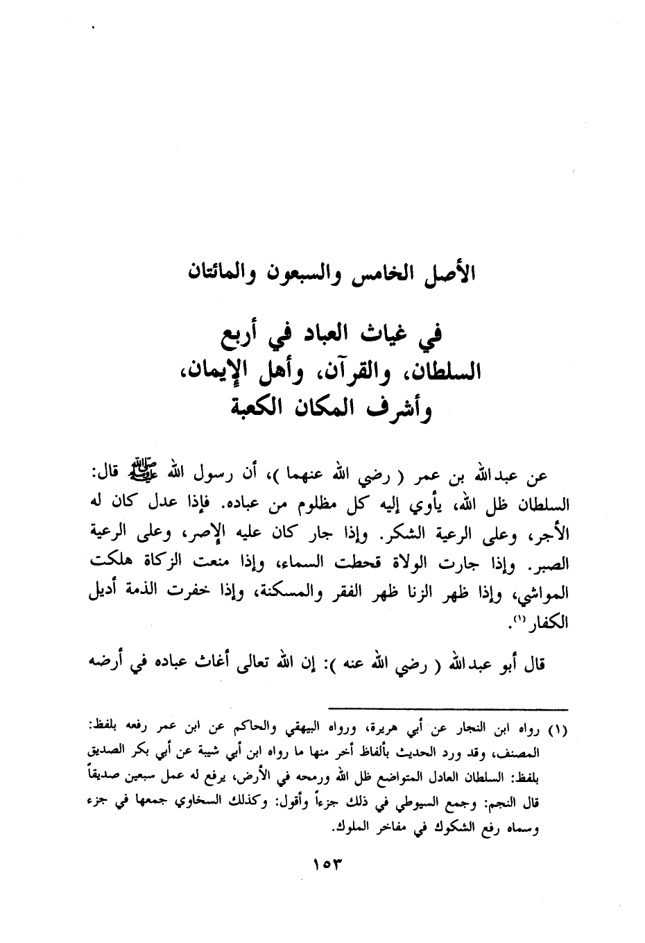 عَن عبد الله بن عمر رَضِي الله عَنْهُمَا أَن رَسُول الله صلى الله عَلَيْهِ وَسلم قَالَ السُّلْطَان ظلّ الله يأوي إِلَيْهِ كل مظلوم من عباده فَإِذا عدل كَانَ لَهُ الْأجر وعَلى الرّعية الشُّكْر وَإِذا جَار كَانَ عَلَيْهِ الإصر وعَلى الرّعية الصَّبْر وَإِذا جارت الْوُلَاة قحطت السَّمَاء وَإِذا منعت الزَّكَاة هَلَكت الْمَوَاشِي وَإِذا ظهر الزِّنَا ظهر الْفقر والمسكنة وَإِذا خفرت الذِّمَّة أديل الْكفَّار