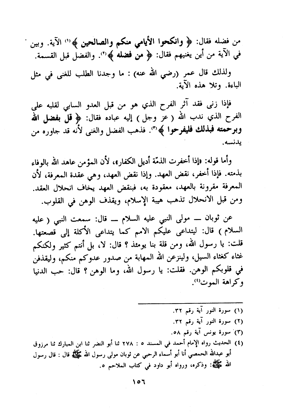 عَن ثَوْبَان مولى النَّبِي عَلَيْهِ السَّلَام قَالَ سَمِعت النَّبِي عَلَيْهِ السَّلَام قَالَ ليتداعى عَلَيْكُم الْأُمَم كَمَا يتداعى الْأكلَة إِلَى قصعتها قلت يَا رَسُول الله وَمن قلَّة بِنَا يَوْمئِذٍ قَالَ لَا بل أَنْتُم كثير وَلَكِنَّكُمْ غثاء كغثاء السَّيْل وَلَينْزَعَنَّ الله المهابة من صُدُور عَدوكُمْ مِنْكُم وليقذفن فِي قُلُوبكُمْ الوهن فَقلت يَا رَسُول الله وَمَا الوهن قَالَ حب الدُّنْيَا وَكَرَاهَة الْمَوْت