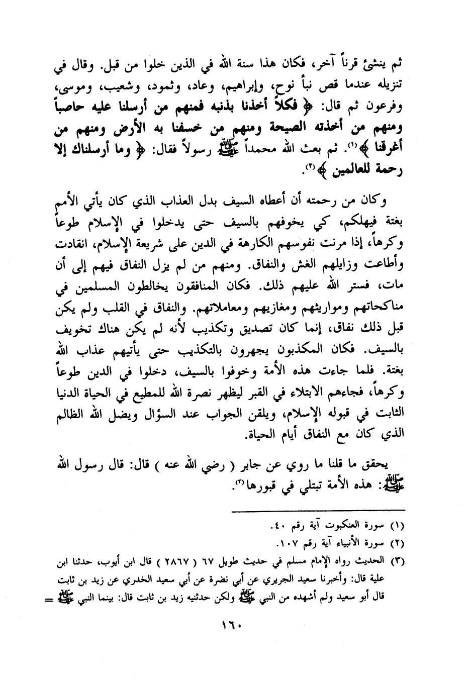 ثمَّ ينشئ قرنا آخر فَكَانَ هَذَا سنة الله فِي الَّذين خلوا من قبل وَقَالَ فِي تَنْزِيله عِنْدَمَا قصّ نبأ نوح وَإِبْرَاهِيم وَعَاد وَثَمُود وَشُعَيْب ومُوسَى وَفرْعَوْن ثمَّ قَالَ {فكلا أَخذنَا بِذَنبِهِ فَمنهمْ من أرسلنَا عَلَيْهِ حاصبا وَمِنْهُم من أَخَذته الصَّيْحَة وَمِنْهُم من خسفنا بِهِ الأَرْض وَمِنْهُم من أغرقنا} ثمَّ بعث الله مُحَمَّدًا صلى الله عَلَيْهِ وَسلم رَسُولا فَقَالَ {وَمَا أَرْسَلْنَاك إِلَّا رَحْمَة للْعَالمين}