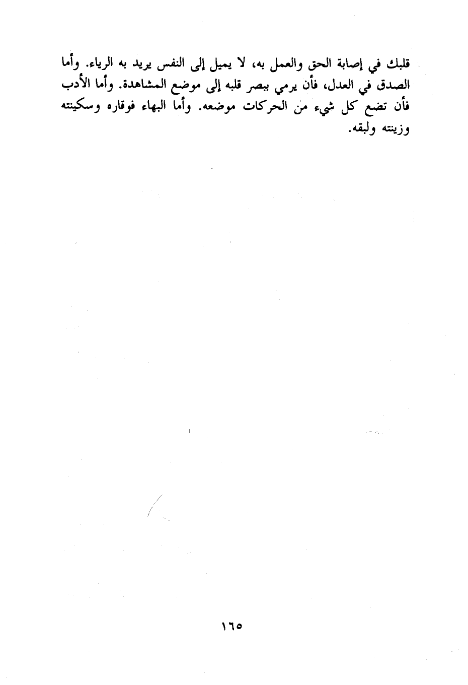 قَلْبك فِي إِصَابَة الْحق وَالْعَمَل بِهِ لَا يمِيل إِلَى النَّفس يُرِيد بِهِ الرِّيَاء وَأما الصدْق فِي الْعدْل فَأن يَرْمِي ببصر قلبه إِلَى مَوضِع الْمُشَاهدَة وَأما الْأَدَب فَأن تضع كل شَيْء من الحركات مَوْضِعه وَأما الْبَهَاء فوقاره وسكينته وزينته ولبقه
