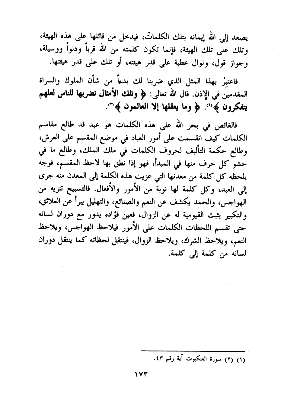 فالغائص فِي بَحر الله على هَذِه الْكَلِمَات هُوَ عبد قد طالع مقاسم الْكَلِمَات كَيفَ انقسمت على أُمُور الْعباد فِي مَوضِع الْمقسم على الْعَرْش وطالع حِكْمَة التَّأْلِيف لحروف الْكَلِمَات فِي ملك الْملك وطالع مَا فِي حَشْو كل حرف مِنْهَا فِي المبدأ فَهُوَ إِذا نطق بهَا لاحظ الْمقسم فَوجه يلحظه كل كلمة من مَعْدِنهَا الَّتِي عزيت هَذِه الْكَلِمَة إِلَى الْمَعْدن مِنْهُ جرى إِلَى العَبْد وكل كلمة لَهَا نوبَة من الْأُمُور وَالْأَفْعَال فالتسبيح تَنْزِيه من الهواجس وَالْحَمْد يكْشف عَن النعم والصنائع والتهليل يبرأ عَن العلائق وَالتَّكْبِير يثبت القيومية لَهُ عَن الزَّوَال فعين فُؤَاده يَدُور مَعَ دوران لِسَانه حَتَّى تقسم اللحظات الْكَلِمَات على الْأُمُور فيلاحظ الهواجس ويلاحظ النعم ويلاحظ الشّرك ويلاحظ الزَّوَال فَينْتَقل لحظاته كَمَا ينْتَقل دوران لِسَانه من كلمة إِلَى كلمة