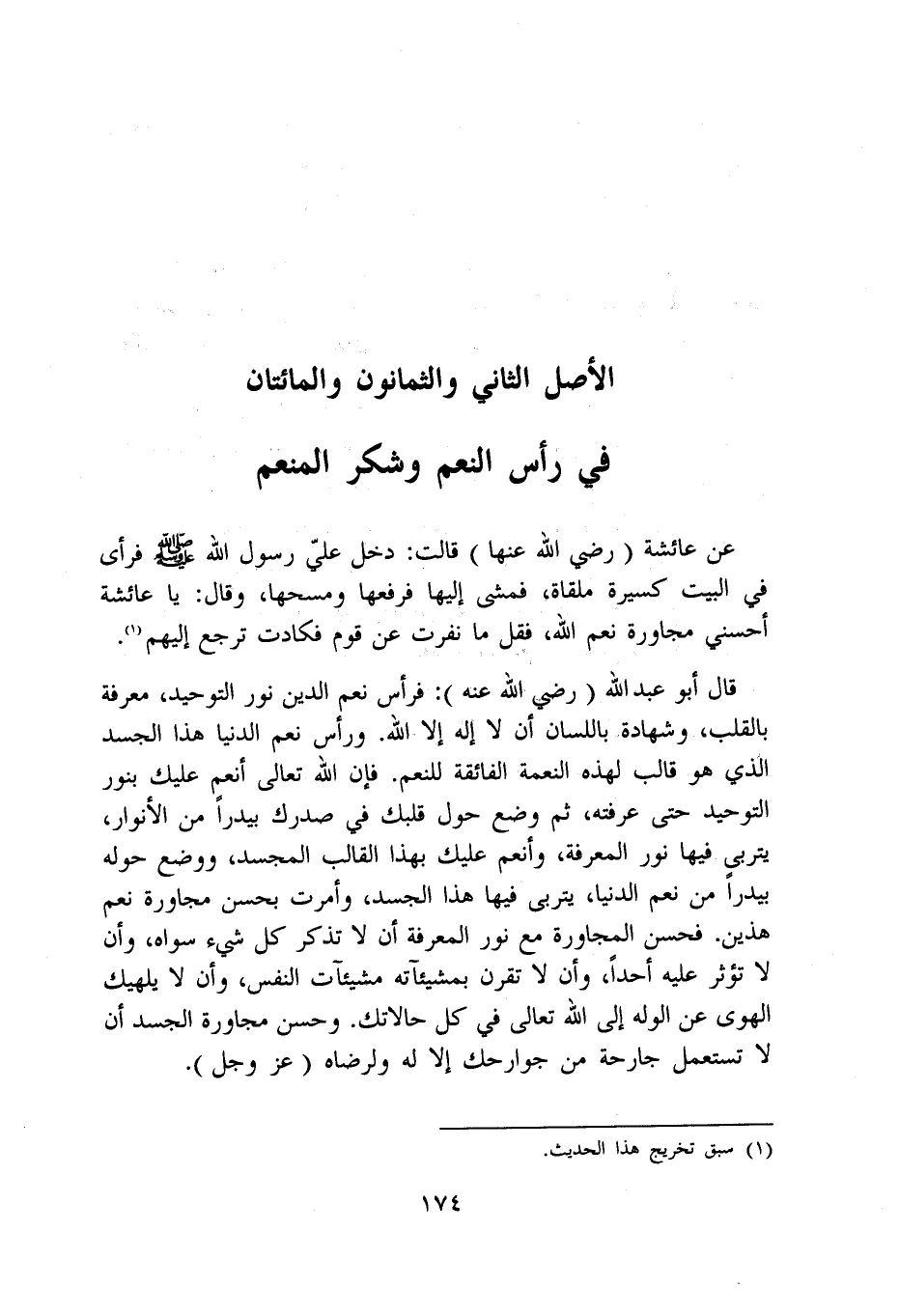 قَالَ أَبُو عبد الله رَضِي الله عَنهُ فرأس نعم الدّين نور التَّوْحِيد معرفَة بِالْقَلْبِ وَشَهَادَة بِاللِّسَانِ أَن لَا إِلَه إِلَّا الله وَرَأس نعم الدُّنْيَا هَذَا الْجَسَد الَّذِي هُوَ قالب لهَذِهِ النِّعْمَة الفائقة للنعم فَإِن الله تَعَالَى أنعم عَلَيْك بِنور التَّوْحِيد حَتَّى عَرفته ثمَّ وضع حول قَلْبك فِي صدرك بيدرا من الْأَنْوَار يتربى فِيهَا نور الْمعرفَة وأنعم عَلَيْك بِهَذَا القالب المجسد وَوضع حوله بيدرا من نعم الدُّنْيَا يتربى فِيهَا هَذَا الْجَسَد وَأمرت بِحسن مجاورة نعم هذَيْن فَحسن الْمُجَاورَة مَعَ نور الْمعرفَة أَن لَا تذكر كل شَيْء سواهُ وَأَن لَا تُؤثر عَلَيْهِ أحدا وَأَن لَا تقرن بمشيئآته مشيئآت النَّفس وَأَن لَا يُلْهِيك الْهوى عَن الوله إِلَى الله تَعَالَى فِي كل حالاتك وَحسن مجاورة الْجَسَد أَن لَا تسْتَعْمل جارحة من جوارحك إِلَّا لَهُ ولرضاه عز وَجل
