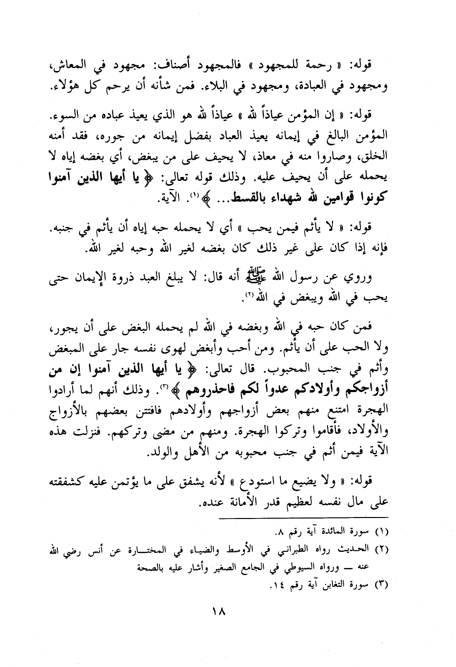 فَمن كَانَ حبه فِي الله وبغضه فِي الله لم يحملهُ البغض على أَن يجور وَلَا الْحبّ على أَن يَأْثَم وَمن أحب وَأبْغض لهوى نَفسه جَار على الْمُبْغض وأثم فِي جنب المحبوب قَالَ تَعَالَى {يَا أَيهَا الَّذين آمنُوا إِن من أزواجكم وَأَوْلَادكُمْ عدوا لكم فاحذروهم} وَذَلِكَ أَنهم لما أَرَادوا الْهِجْرَة امْتنع مِنْهُم بعض أَزوَاجهم وَأَوْلَادهمْ فَافْتتنَ بَعضهم بالأزواج وَالْأَوْلَاد فأقاموا وَتركُوا الْهِجْرَة وَمِنْهُم من مضى وتركهم فَنزلت هَذِه الْآيَة فِيمَن أَثم فِي جنب محبوبه من الْأَهْل وَالْولد