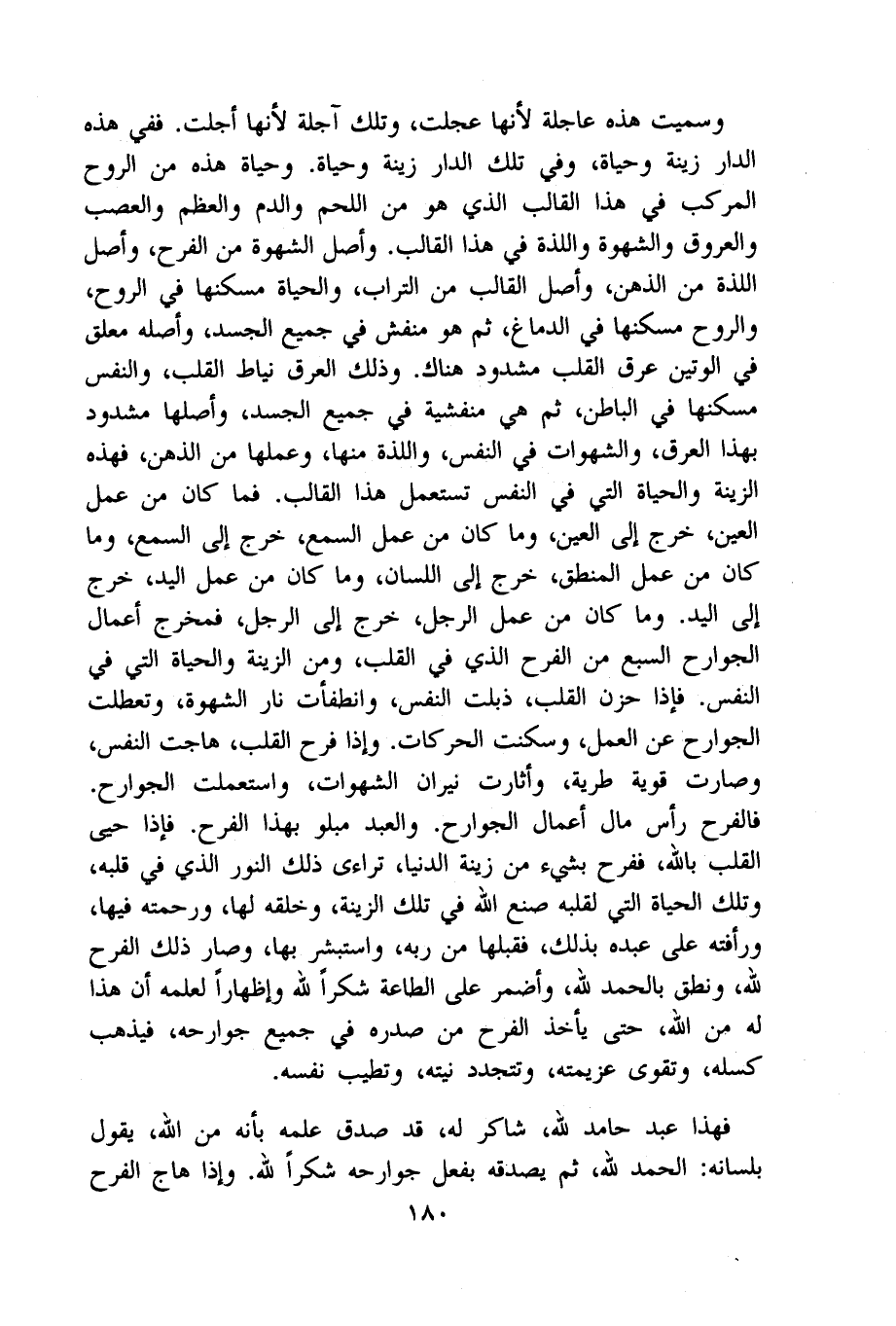 وَسميت هَذِه عاجلة لِأَنَّهَا عجلت وَتلك آجلة لِأَنَّهَا أجلت فَفِي هَذِه الدَّار زِينَة وحياة وَفِي تِلْكَ الدَّار زِينَة وحياة وحياة هَذِه من الرّوح الْمركب فِي هَذَا القالب الَّذِي هُوَ من اللَّحْم وَالدَّم والعظم والعصب وَالْعُرُوق والشهوة واللذة فِي هَذَا القالب وأصل الشَّهْوَة من الْفَرح وأصل اللَّذَّة من الذِّهْن وأصل القالب من التُّرَاب والحياة مَسْكَنهَا فِي الرّوح وَالروح مَسْكَنهَا فِي الدِّمَاغ ثمَّ هُوَ منفش فِي جَمِيع الْجَسَد وَأَصله مُعَلّق فِي الوتين عرق الْقلب مشدود هُنَاكَ وَذَلِكَ الْعرق نِيَاط الْقلب وَالنَّفس مَسْكَنهَا فِي الْبَاطِن ثمَّ هِيَ منفشية فِي جَمِيع الْجَسَد وَأَصلهَا مشدود بِهَذَا الْعرق والشهوات فِي النَّفس واللذة مِنْهَا وعملها من الذِّهْن فَهَذِهِ الزِّينَة والحياة الَّتِي فِي النَّفس تسْتَعْمل هَذَا القالب فَمَا كَانَ من عمل الْعين خرج إِلَى الْعين وَمَا كَانَ من عمل السّمع خرج إِلَى السّمع وَمَا كَانَ من عمل الْمنطق خرج إِلَى اللِّسَان وَمَا كَانَ من عمل الْيَد خرج إِلَى الْيَد وَمَا كَانَ من عمل الرجل خرج إِلَى الرجل فمخرج أَعمال الْجَوَارِح السَّبع من الْفَرح الَّذِي فِي الْقلب وَمن الزِّينَة والحياة الَّتِي فِي النَّفس فَإِذا حزن الْقلب ذبلت النَّفس وانطفأت نَار الشَّهْوَة وتعطلت الْجَوَارِح عَن الْعَمَل وسكنت الحركات وَإِذا فَرح الْقلب هَاجَتْ النَّفس وَصَارَت قَوِيَّة طرية وأثارت نيران الشَّهَوَات واستعملت الْجَوَارِح فالفرح رَأس مَال أَعمال الْجَوَارِح وَالْعَبْد مبلو بِهَذَا الْفَرح فَإِذا حيى الْقلب بِاللَّه ففرح بِشَيْء من زِينَة الدُّنْيَا ترَاءى ذَلِك النُّور الَّذِي فِي قلبه وَتلك الْحَيَاة الَّتِي لِقَلْبِهِ صنع الله فِي تِلْكَ الزِّينَة وخلقه لَهَا وَرَحمته فِيهَا ورأفته على عَبده بذلك فقبلها من ربه واستبشر بهَا وَصَارَ ذَلِك الْفَرح لله ونطق بِالْحَمْد لله وأضمر على الطَّاعَة شكرا لله وإظهارا لعلمه أَن هَذَا لَهُ من الله حَتَّى يَأْخُذ الْفَرح من صَدره فِي جَمِيع جوارحه فَيذْهب كسله وتقوى عزيمته وتتجدد نِيَّته وتطيب نَفسه