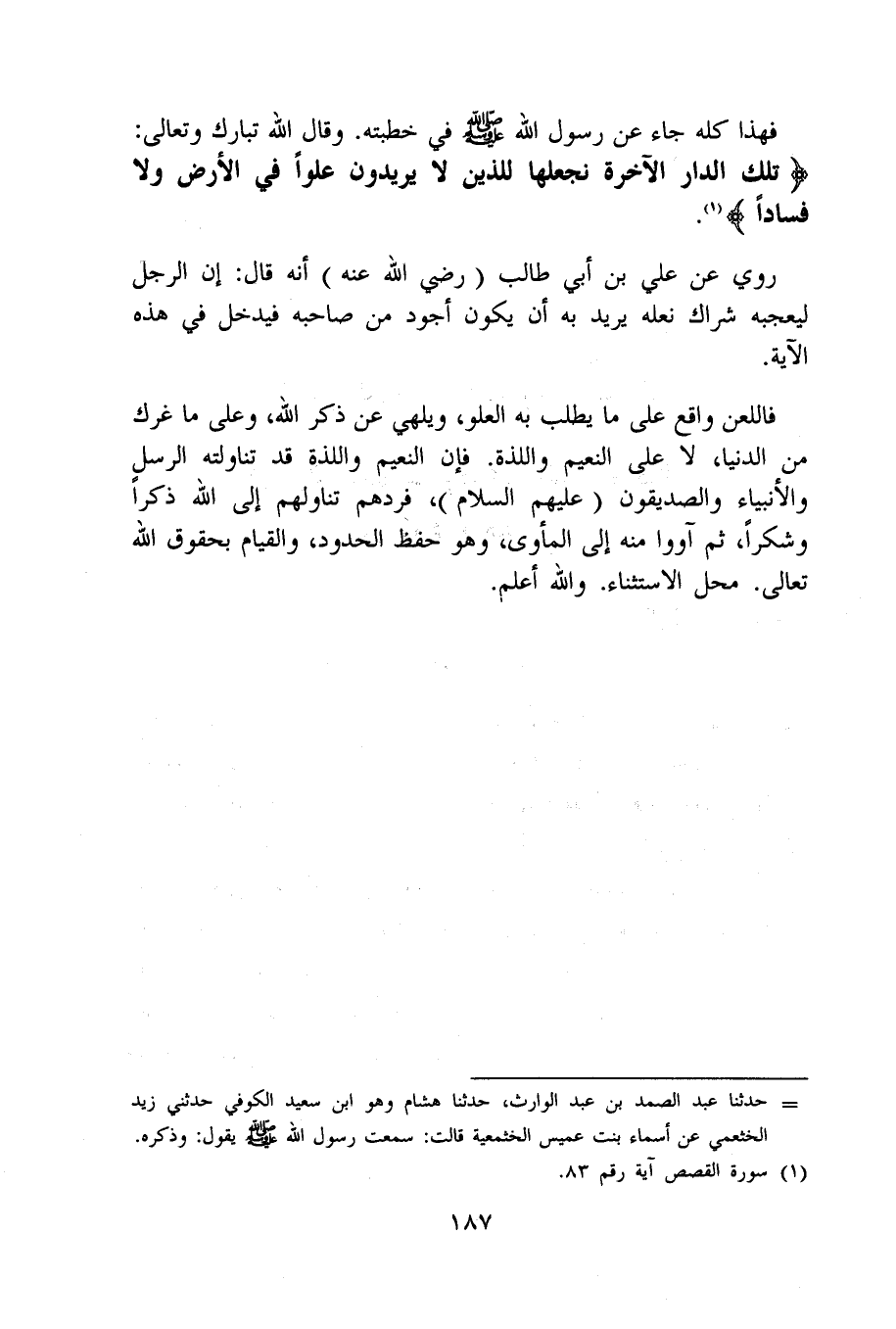 فَهَذَا كُله جَاءَ عَن رَسُول الله صلى الله عَلَيْهِ وَسلم فِي خطبَته وَقَالَ الله تبَارك وَتَعَالَى {تِلْكَ الدَّار الْآخِرَة نَجْعَلهَا للَّذين لَا يُرِيدُونَ علوا فِي الأَرْض وَلَا فَسَادًا}