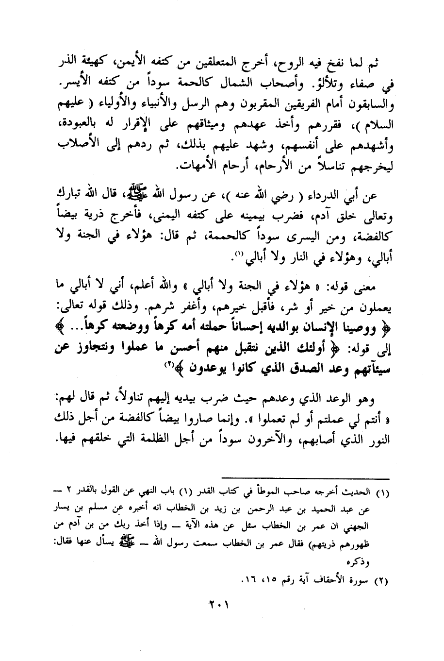 عَن أبي الدَّرْدَاء رَضِي الله عَنهُ عَن رَسُول الله صلى الله عَلَيْهِ وَسلم قَالَ الله تبَارك وَتَعَالَى خلق آدم فَضرب بِيَمِينِهِ على كتفه الْيُمْنَى فَأخْرج ذُرِّيَّة بيضًا كالفضة وَمن الْيُسْرَى سُودًا كالحممة ثمَّ قَالَ هَؤُلَاءِ فِي الْجنَّة وَلَا أُبَالِي وَهَؤُلَاء فِي النَّار وَلَا أُبَالِي