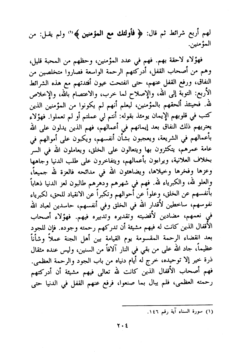 فَهَؤُلَاءِ لاحقة بهم فهم فِي عدد الْمُؤمنِينَ وحظهم من الْمحبَّة قَلِيل وهم من أَصْحَاب القفل أدركتهم الرَّحْمَة الواسعة فصاروا متخلصين من النِّفَاق وَرفع القفل عَنْهُم حَتَّى انفتحت عُيُون أفئدتهم مَعَ هَذِه الشَّرَائِط الْأَرْبَع التَّوْبَة إِلَى الله والإصلاح لما خرب والاعتصام بِاللَّه وَالْإِخْلَاص لله فَحِينَئِذٍ ألحقهم بِالْمُؤْمِنِينَ ليعلم أَنهم لم يَكُونُوا من الْمُؤمنِينَ الَّذين كتب فِي قُلُوبهم الْإِيمَان يَوْمئِذٍ بقوله أَنْتُم لي عملتم أَو لم تعملوا فَهَؤُلَاءِ يعتريهم ذَلِك النِّفَاق بعد إِيمَانهم فِي اعمالهم فهم الَّذين يدلون على الله بأعمالهم فِي الشَّرِيعَة ويعجبون بشأن أنفسهم ويكبون على أَمْوَالهم فِي عَامَّة عمرهم يتكثرون بهَا ويتعالون على الْخلق ويعاملون الله فِي السِّرّ بِخِلَاف الْعَلَانِيَة ويراءون بأعمالهم ويتفاخرون على طلب الدُّنْيَا وجاهها وعزها وَفَخْرهَا وخيلاها ويضاهئون الله فِي مدائحه فالعزة لله جَمِيعًا والعلو لله والكبرياء لله فهم فِي شهرهم ودهرهم طالبون لعز الدُّنْيَا ذَهَابًا بِأَنْفسِهِم عَن الْخلق وعلوا عَن أَحْوَالهم وتكبرا عَن الانقياد للحق لكبرياء نُفُوسهم ساخطين لأقدار الله فِي الْخلق وَفِي أنفسهم حاسدين لعباد الله فِي نعمهم مضادين لأقضيته وَتَقْدِيره وتدبيره فيهم فَهَؤُلَاءِ أَصْحَاب الأقفال الَّذين كَانَت لَهُ فيهم مَشِيئَة أَن تُدْرِكهُمْ رَحمته وجوده فَإِن للجود بعد انْقِضَاء الرَّحْمَة المقسومة يَوْم الْقِيَامَة بَين أهل الْجنَّة عملا وشأنا عَظِيما جاد الله على من بَقِي فِي النَّار آلافا من السنين وَلَيْسَ عِنْده مِثْقَال ذرة خير إِلَّا توحيده خرج لَهُ أَيَّام دُنْيَاهُ من بَاب الْجُود وَالرَّحْمَة الْعُظْمَى فهم أَصْحَاب الأقفال الَّذين كَانَت لله تَعَالَى فيهم مَشِيئَة أَن أدركتهم رَحمته الْعُظْمَى فَلم يبال بِمَا صَنَعُوا فَرفع عَنْهُم القفل فِي الدُّنْيَا حَتَّى