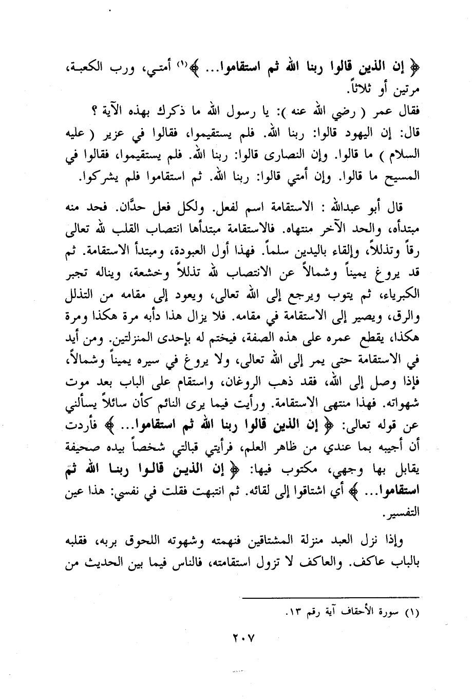 قَالَ أَبُو عبد الله الاسْتقَامَة اسْم لفعل وَلكُل فعل حدان فحد مِنْهُ مبتدأه وَالْحَد الآخر منتهاه فالاستقامة مبتدأها انتصاب الْقلب لله تَعَالَى رقا وتذللا وإلقاء باليدين سلما فَهَذَا أول العبودة ومبتدأ الاسْتقَامَة ثمَّ قد يروغ يَمِينا وَشمَالًا عَن الانتصاب لله تذللا وخشعة ويناله تجبر الْكِبْرِيَاء ثمَّ يَتُوب وَيرجع إِلَى الله تَعَالَى وَيعود إِلَى مقَامه من التذلل وَالرّق وَيصير إِلَى الاسْتقَامَة فِي مقَامه فَلَا يزَال هَذَا دأبه مرّة هَكَذَا وَمرَّة هَكَذَا يقطع عمره على هَذِه الصّفة فيختم لَهُ بِإِحْدَى المنزلتين وَمن أيد فِي الاسْتقَامَة حَتَّى يمر إِلَى الله تَعَالَى وَلَا يروغ فِي سيره يَمِينا وَشمَالًا فَإِذا وصل إِلَى الله فقد ذهب الروغان واستقام على الْبَاب بعد موت شهواته فَهَذَا مُنْتَهى الاسْتقَامَة وَرَأَيْت فِيمَا يرى النَّائِم كَأَن سَائِلًا يسألني عَن قَوْله تَعَالَى {إِن الَّذين قَالُوا رَبنَا الله ثمَّ استقاموا} فَأَرَدْت أَن أُجِيبهُ بِمَا عِنْدِي من ظَاهر الْعلم فرأيتي قبالتي شخصا بِيَدِهِ صحيفَة يُقَابل بهَا وَجْهي مَكْتُوب فِيهَا {إِن الَّذين قَالُوا رَبنَا الله ثمَّ استقاموا} أَي اشتاقوا إِلَى لِقَائِه ثمَّ انْتَبَهت فَقلت فِي نَفسِي هَذَا عين التَّفْسِير
