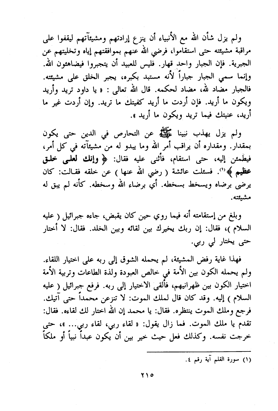 وَلم يزل يهذب نَبينَا صلى الله عَلَيْهِ وَسلم عَن التحارص فِي الدّين حَتَّى يكون بِمِقْدَار ومقداره أَن يراقب أَمر الله وَمَا يَبْدُو لَهُ من مشيئآته فِي كل أَمر فيطمئن إِلَيْهِ حَتَّى استقام فَأثْنى عَلَيْهِ فَقَالَ {وَإنَّك لعلى خلق عَظِيم} فَسُئِلت عَائِشَة رَضِي الله عَنْهَا عَن خلقه فَقَالَت كَانَ يرضى بِرِضَاهُ ويسخط بسخطه أَي برضاء الله وَسخطه كَأَنَّهُ لم يبْق لَهُ مَشِيئَته