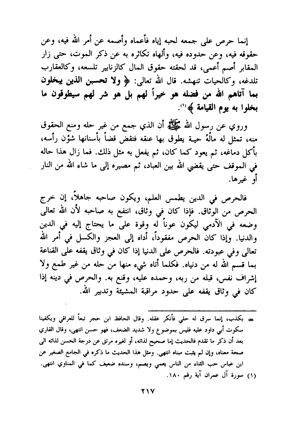 إِنَّمَا حرص على جمعه لحبه إِيَّاه فأعماه وأصمه عَن أَمر الله فِيهِ وَعَن حُقُوقه فِيهِ وَعَن حُدُوده فِيهِ وألهاه تكاثره بِهِ عَن ذكر الْمَوْت حَتَّى زار الْمَقَابِر أَصمّ أعمى قد لحقته حُقُوق المَال كالزنابير تلسعه وكالعقارب تلدغه وكالحيات تنهشه قَالَ الله تَعَالَى وَلَا تحسبن الَّذين يَبْخلُونَ بِمَا آتَاهُم الله من فَضله هُوَ خيرا لَهُم بل هُوَ شَرّ لَهُم سيطوقون مَا بخلوا بِهِ يَوْم الْقِيَامَة