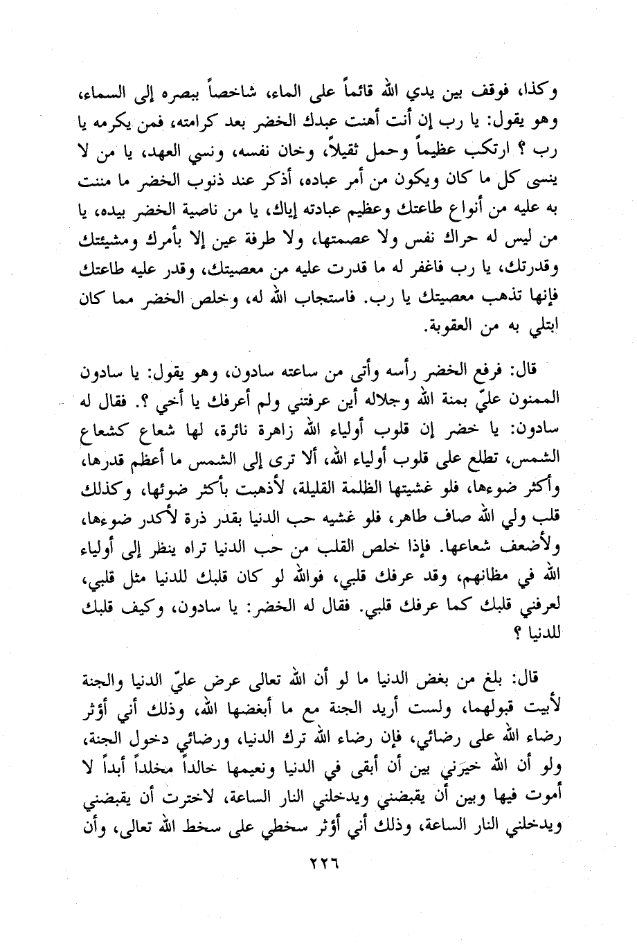 قَالَ فَرفع الْخضر رَأسه وأتى من سَاعَته سادون وَهُوَ يَقُول يَا سادون الْمَمْنُون عَليّ بمنة الله وجلاله أَيْن عَرفتنِي وَلم أعرفك يَا أخي فَقَالَ لَهُ سادون يَا خضر إِن قُلُوب أَوْلِيَاء الله زاهرة نائرة لَهَا شُعَاع كشعاع الشَّمْس تطلع على قُلُوب أَوْلِيَاء الله أَلا ترى إِلَى الشَّمْس مَا أعظم قدرهَا وَأكْثر ضوءها فَلَو غشيتها الظلمَة القليلة لأذهبت بِأَكْثَرَ ضوئها وَكَذَلِكَ قلب ولي الله صَاف طَاهِر فَلَو غشيه حب الدُّنْيَا بِقدر ذرة لأكدر ضوءها ولأضعف شعاعها فَإِذا خلص الْقلب من حب الدُّنْيَا ترَاهُ ينظر إِلَى أَوْلِيَاء الله فِي مظانهم وَقد عرفك قلبِي فو الله لَو كَانَ قَلْبك للدنيا مثل قلبِي لعرفني قَلْبك كَمَا عرفك قلبِي فَقَالَ لَهُ الْخضر يَا سادون وَكَيف قَلْبك للدنيا