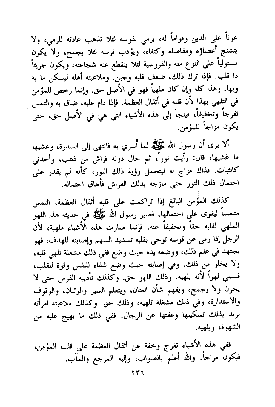 عونا على الدّين وقواما لَهُ يَرْمِي بقوسه لِئَلَّا تذْهب عَادَته للرمي وَلَا يتشنج أعضاؤه ومفاصله وكتفاه ويؤدب فرسه لِئَلَّا يجمح وَلَا يكون مستوليا على النزع مِنْهُ والفروسية لِئَلَّا يَنْقَطِع عَنهُ شجاعته وَيكون جريئا ذَا قلب فَإِذا ترك ذَلِك ضعف قلبه وَجبن وملاعبته أَهله ليسكن مَا بِهِ وَبهَا وَهَذَا كُله وَإِن كَانَ ملهيا فَهُوَ فِي الأَصْل حق وَإِنَّمَا رخص لِلْمُؤمنِ فِي التلهي بِهَذَا لِأَن قلبه فِي أثقال العظمة فَإِذا دَامَ عَلَيْهِ ضَاقَ بِهِ وَالْتمس تفرجا وتخفيفا فيلجأ إِلَى هَذِه الْأَشْيَاء الَّتِي هِيَ فِي الأَصْل حق حَتَّى يكون مزاجا لِلْمُؤمنِ