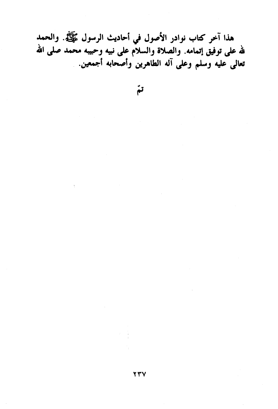 هَذَا آخر كتاب نَوَادِر الْأُصُول فِي أَحَادِيث الرَّسُول صلى الله عَلَيْهِ وَسلم وَالْحَمْد لله على توفيق إِتْمَامه وَالصَّلَاة وَالسَّلَام على نبيه وحبيبه مُحَمَّد صلى الله تَعَالَى عَلَيْهِ وَسلم وعَلى آله الطاهرين وَأَصْحَابه أَجْمَعِينَ تمّ