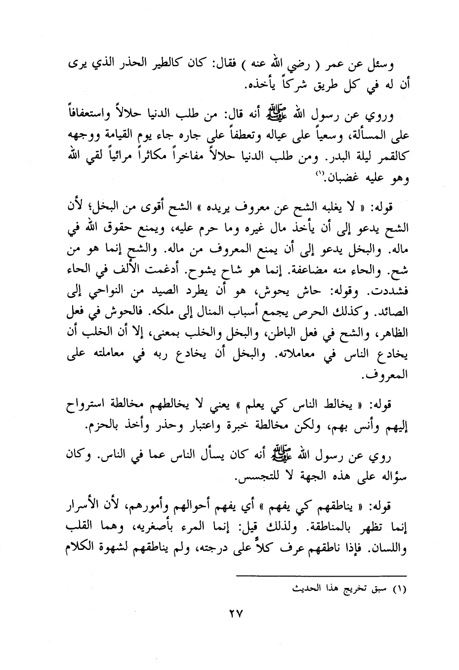 وَسُئِلَ عَن عمر رَضِي الله عَنهُ فَقَالَ كَانَ كالطير الحذر الَّذِي يرى أَن لَهُ فِي كل طَرِيق شركا يَأْخُذهُ