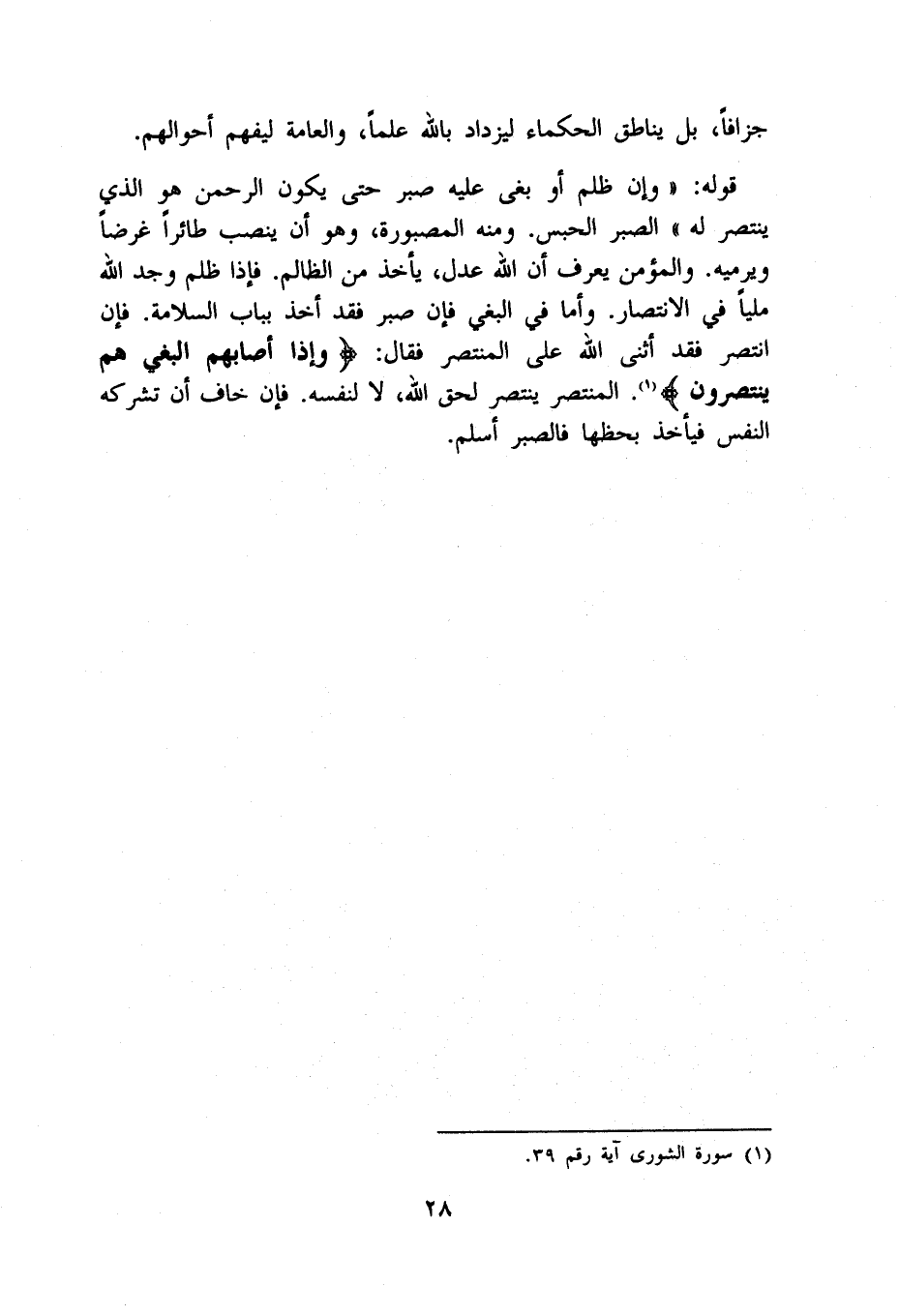 قَوْله وَإِن ظلم أَو بغى عَلَيْهِ صَبر حَتَّى يكون الرَّحْمَن هُوَ الَّذِي ينتصر لَهُ الصَّبْر الْحَبْس وَمِنْه المصبورة وَهُوَ أَن ينصب طائرا غَرضا ويرميه وَالْمُؤمن يعرف أَن الله عدل يَأْخُذ من الظَّالِم فَإِذا ظلم وجد الله مَلِيًّا فِي الِانْتِصَار وَأما فِي الْبَغي فَإِن صَبر فقد أَخذ بِبَاب السَّلامَة فَإِن انتصر فقد أثنى الله على الْمُنْتَصر فَقَالَ وَإِذا أَصَابَهُم الْبَغي هم ينتصرون الْمُنْتَصر ينتصر لحق الله لَا لنَفسِهِ فَإِن خَافَ أَن تشركه النَّفس فَيَأْخُذ بحظها فالصبر أسلم