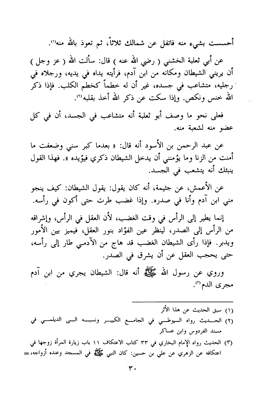 عَن الْأَعْمَش عَن جثيمة أَنه كَانَ يَقُول يَقُول الشَّيْطَان كَيفَ ينجو مني ابْن آدم وَأَنا فِي صَدره وَإِذا غضب طرت حَتَّى أكون فِي رَأسه