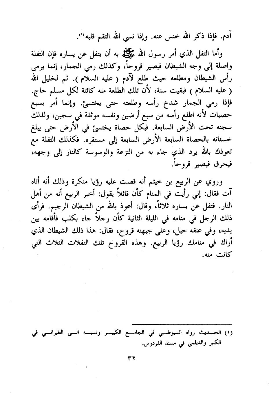 وَأما التفل الَّذِي أَمر رَسُول الله صلى الله عَلَيْهِ وَسلم بِهِ أَن يتفل عَن يسَاره فَإِن التفلة واصلة إِلَى وَجه الشَّيْطَان فَيصير قروحا وَكَذَلِكَ رمي الْجمار إِنَّمَا يرْمى رَأس الشَّيْطَان ومطلعه حَيْثُ طلع لآدَم عَلَيْهِ السَّلَام ثمَّ لخليل الله عَلَيْهِ السَّلَام فَبَقيت سنة لِأَن تِلْكَ الطلعة مِنْهُ كائنة لكل مُسلم حَاج فَإِذا رمي الْجمار شدخ رَأسه وطلعته حَتَّى يختسئ وَإِنَّمَا أَمر بِسبع حَصَيَات لِأَنَّهُ اطلع رَأسه من سبع أَرضين وَنَفسه موثقة فِي سِجِّين وَلذَلِك سجنه تَحت الأَرْض السَّابِعَة فبكل حَصَاة يختسئ فِي الأَرْض حَتَّى يبلغ خسئاته بالحصاة السَّابِعَة الأَرْض السَّابِعَة إِلَى مستقره فَكَذَلِك التفلة مَعَ تعوذك بِاللَّه يرد الَّذِي جَاءَ بِهِ من النزعة والوسوسة كالنار إِلَى وَجهه فيحرق فَيصير قروحا
