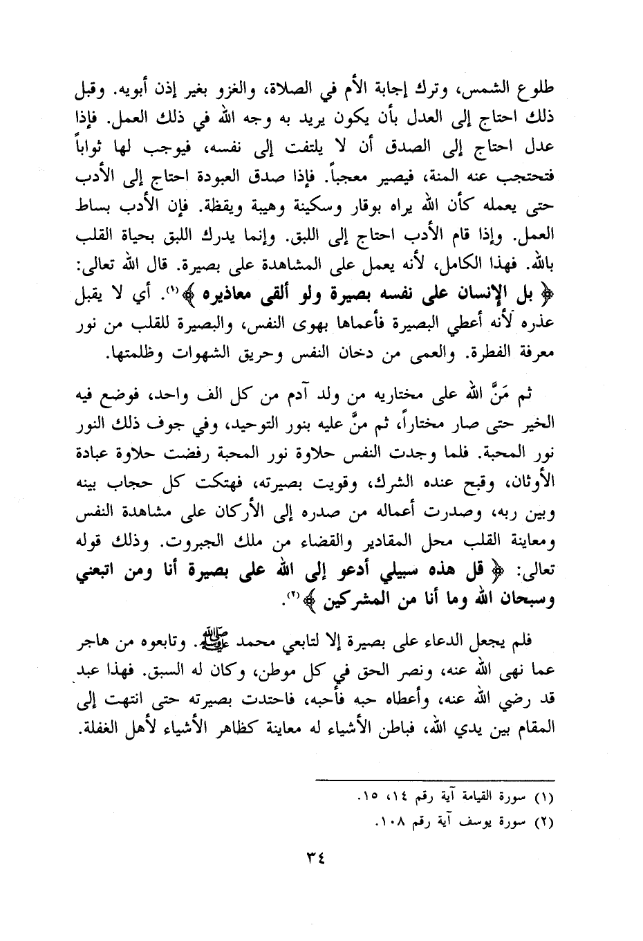 فَلم يَجْعَل الدُّعَاء على بَصِيرَة إِلَّا لتابعي مُحَمَّد صلى الله عَلَيْهِ وَسلم وتابعوه من هَاجر عَمَّا نهى الله عَنهُ وَنصر الْحق فِي كل موطن وَكَانَ لَهُ السَّبق فَهَذَا عبد قد رَضِي الله عَنهُ وَأَعْطَاهُ حبه فَأَحبهُ فاحتدت بصيرته حَتَّى انْتَهَت إِلَى الْمقَام بَين يَدي الله فباطن الْأَشْيَاء لَهُ مُعَاينَة كظاهر الْأَشْيَاء لأهل الْغَفْلَة