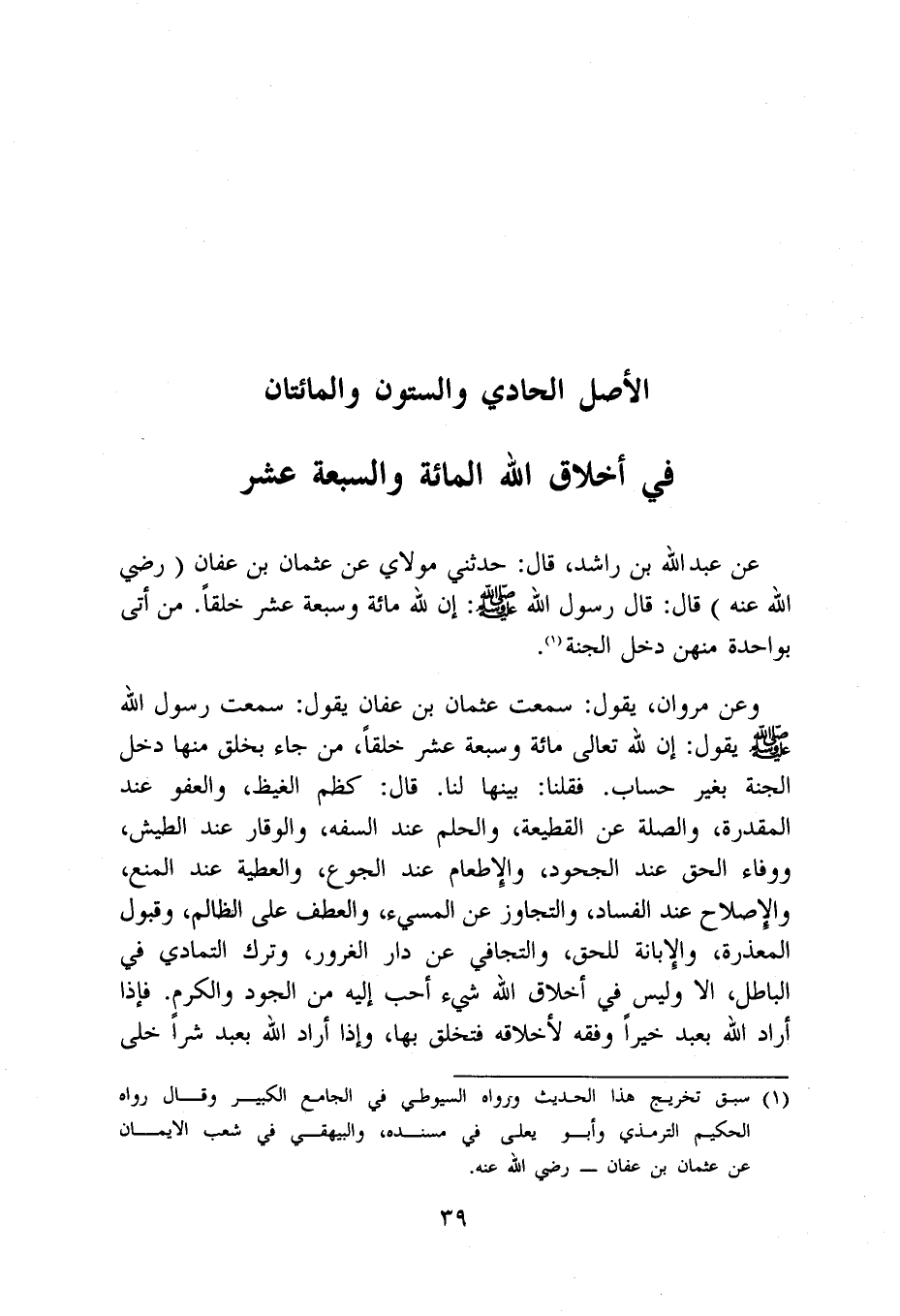 وَعَن مَرْوَان يَقُول سَمِعت عُثْمَان بن عَفَّان يَقُول سَمِعت رَسُول الله صلى الله عَلَيْهِ وَسلم يَقُول إِن لله تَعَالَى مائَة وَسَبْعَة عشر خلقا من جَاءَ بِخلق مِنْهَا دخل الْجنَّة بِغَيْر حِسَاب فَقُلْنَا بَينهَا لنا قَالَ كظم الغيظ وَالْعَفو عِنْد الْمقدرَة والصلة عَن القطيعة والحلم عِنْد السَّفه وَالْوَقار عِنْد الطيش ووفاء الْحق عِنْد الْجُحُود وَالْإِطْعَام عِنْد الْجُوع والعطية عِنْد الْمَنْع والإصلاح عِنْد الْفساد والتجاوز عَن الْمُسِيء والعطف على الظَّالِم وَقبُول المعذرة والإبانة للحق والتجافي عَن دَار الْغرُور وَترك التَّمَادِي فِي الْبَاطِل أَلا وَلَيْسَ فِي أَخْلَاق الله شَيْء أحب إِلَيْهِ من الْجُود وَالْكَرم فَإِذا أَرَادَ الله بِعَبْد خيرا وَفقه لأخلاقه فتخلق بهَا وَإِذا أَرَادَ الله بِعَبْد شرا خلى
