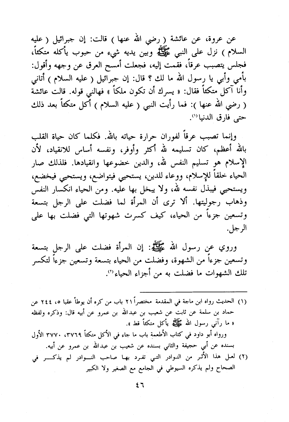 وَرُوِيَ عَن رَسُول الله صلى الله عَلَيْهِ وَسلم إِن الْمَرْأَة فضلت على الرجل بِتِسْعَة وَتِسْعين جُزْءا من الشَّهْوَة وفضلت من الْحيَاء بِتِسْعَة وَتِسْعين جُزْءا لتكسر تِلْكَ الشَّهَوَات مَا فضلت بِهِ من أَجزَاء الْحيَاء