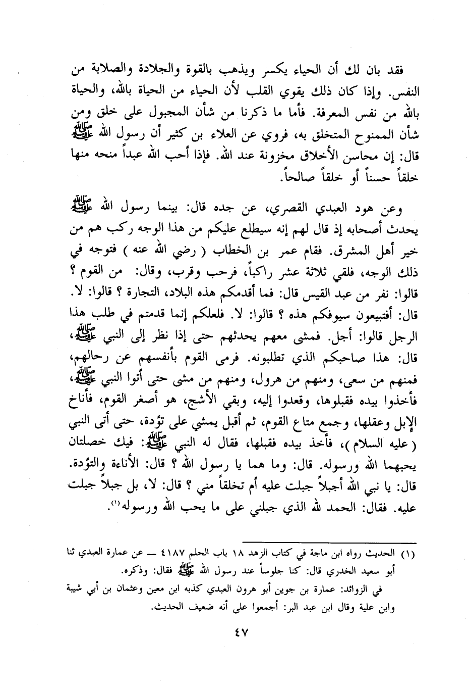 وَعَن هود الْعَبْدي القصري عَن جده قَالَ بَيْنَمَا رَسُول الله صلى الله عَلَيْهِ وَسلم يحدث أَصْحَابه إِذْ قَالَ لَهُم إِنَّه سيطلع عَلَيْكُم من هَذَا الْوَجْه ركب هم من خير أهل الْمشرق فَقَامَ عمر بن الْخطاب رَضِي الله عَنهُ فَتوجه فِي ذَلِك الْوَجْه فلقي ثَلَاثَة عشر رَاكِبًا فَرَحَّبَ وَقرب وَقَالَ من الْقَوْم قَالُوا نفر من عبد الْقَيْس قَالَ فَمَا أقدمكم هَذِه الْبِلَاد التِّجَارَة قَالُوا لَا قَالَ أفتبيعون سُيُوفكُمْ هَذِه قَالُوا لَا فلعلكم إِنَّمَا قدمتم فِي طلب هَذَا الرجل قَالُوا أجل فَمشى مَعَهم يُحَدِّثهُمْ حَتَّى إِذا نظر إِلَى النَّبِي صلى الله عَلَيْهِ وَسلم قَالَ هَذَا صَاحبكُم الَّذِي تطلبونه فَرمى الْقَوْم بِأَنْفسِهِم عَن رحالهم فَمنهمْ من سعى وَمِنْهُم من هرول وَمِنْهُم من مَشى حَتَّى أَتَوا النَّبِي صلى الله عَلَيْهِ وَسلم فَأخذُوا بِيَدِهِ فقبلوها وقعدوا إِلَيْهِ وَبَقِي الْأَشَج هُوَ أَصْغَر الْقَوْم فَأَنَاخَ الْإِبِل وعقلها وَجمع مَتَاع الْقَوْم ثمَّ أقبل يمشي على تؤدة حَتَّى أَتَى النَّبِي عَلَيْهِ السَّلَام فَأخذ بِيَدِهِ فقبلها فَقَالَ لَهُ النَّبِي صلى الله عَلَيْهِ وَسلم فِيك خصلتان يحبهما الله وَرَسُوله قَالَ وَمَا هما يَا رَسُول الله قَالَ الأناءة والتؤدة قَالَ يَا نَبِي الله أجبلا جبلت عَلَيْهِ أم تخلقا مني قَالَ لَا بل جبلا جبلت عَلَيْهِ فَقَالَ الْحَمد لله الَّذِي جبلني على مَا يحب الله وَرَسُوله