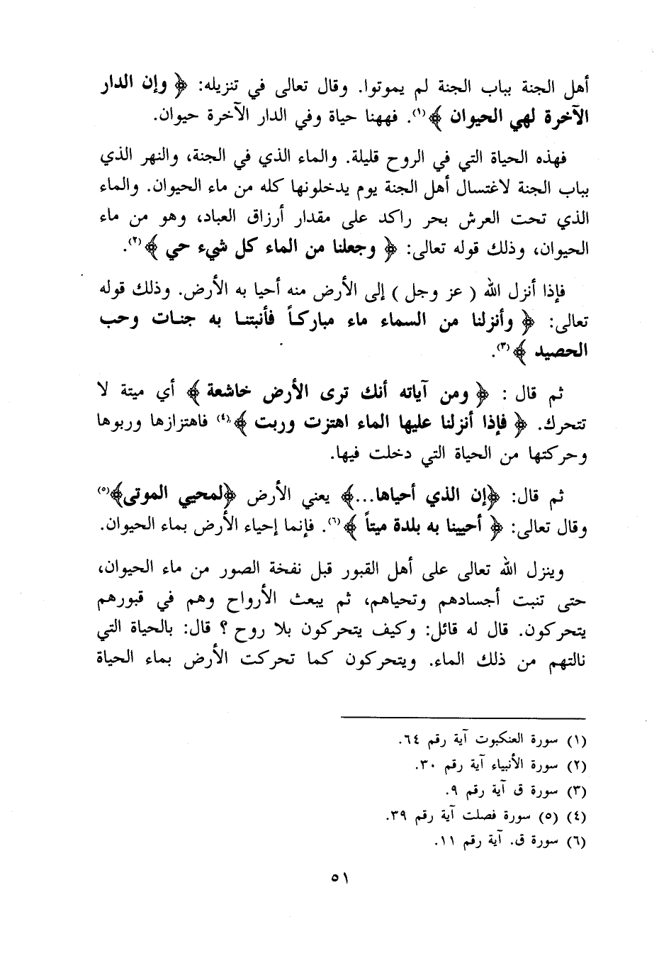 وَينزل الله تَعَالَى على أهل الْقُبُور قبل نفخة الصُّور من مَاء الْحَيَوَان حَتَّى تنْبت أَجْسَادهم وتحياهم ثمَّ يبْعَث الْأَرْوَاح وهم فِي قُبُورهم يتحركون قَالَ لَهُ قَائِل وَكَيف يتحركون بِلَا روح قَالَ بِالْحَيَاةِ الَّتِي نالتهم من ذَلِك المَاء ويتحركون كَمَا تحركت الأَرْض بِمَاء الْحَيَاة