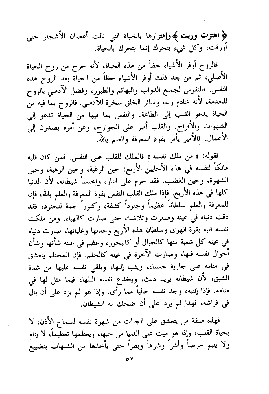 فالروح أوفر الْأَشْيَاء حظا من هَذِه الْحَيَاة لِأَنَّهُ خرج من روح الْحَيَاة الْأَصْلِيّ ثمَّ من بعد ذَلِك أوفر الْأَشْيَاء حظا من الْحَيَاة بعد الرّوح هَذِه النَّفس فالنفوس لجَمِيع الدَّوَابّ والبهائم والطيور وَفضل الْآدَمِيّ بِالروحِ للْخدمَة لِأَنَّهُ خَادِم ربه وَسَائِر الْخلق سخرة للآدمي فالروح بِمَا فِيهِ من الْحَيَاة يَدْعُو الْقلب إِلَى الطَّاعَة وَالنَّفس بِمَا فِيهَا من الْحَيَاة تَدْعُو إِلَى الشَّهَوَات والأفراح وَالْقلب أَمِير على الْجَوَارِح وَعَن أمره يصدرن إِلَى الْأَعْمَال فالأمير يَأْمر بِقُوَّة الْمعرفَة وَالْعلم بِاللَّه