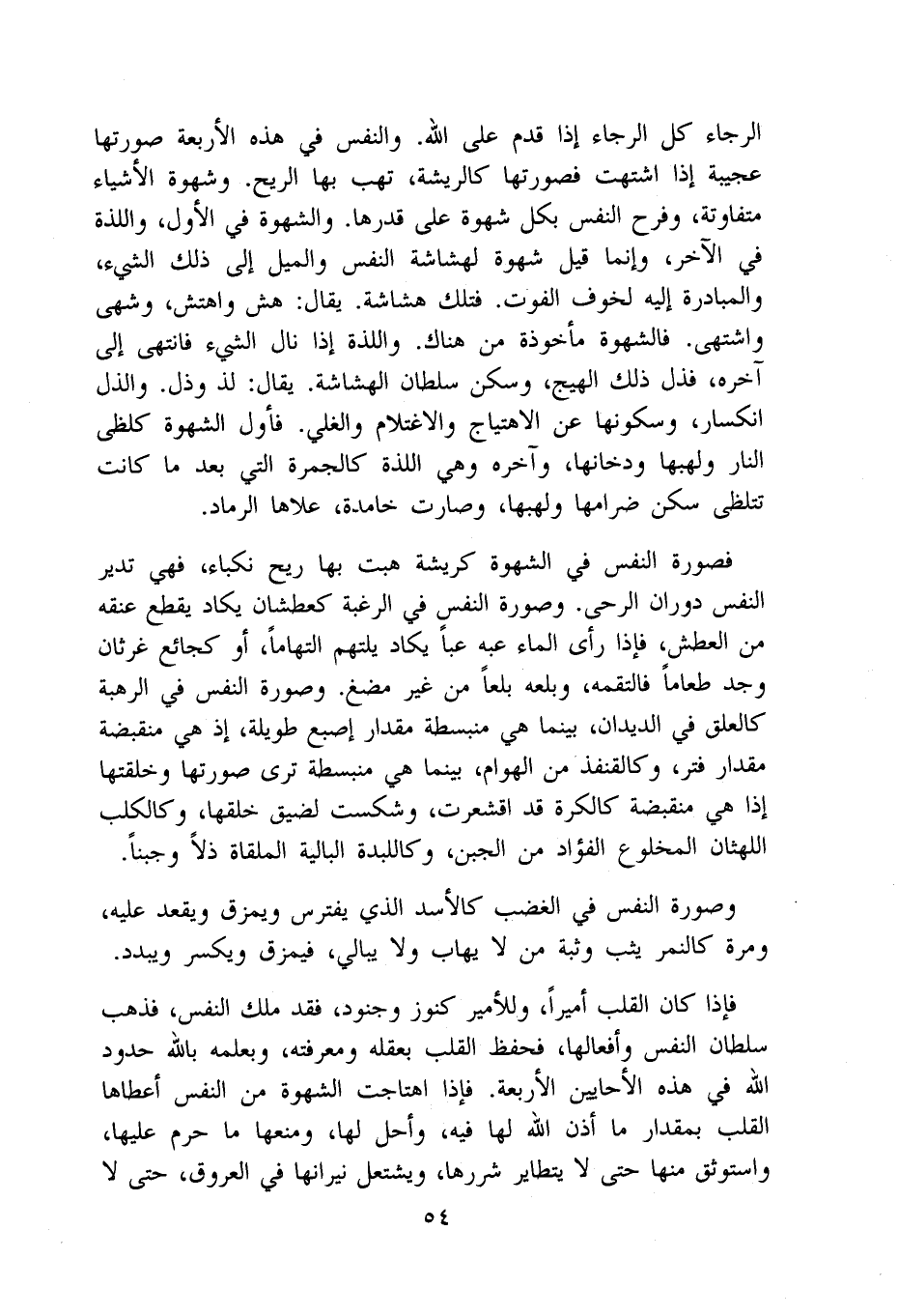 فصورة النَّفس فِي الشَّهْوَة كريشة هبت بهَا ريح نكباء فَهِيَ تدير النَّفس دوران الرَّحَى وَصُورَة النَّفس فِي الرَّغْبَة كعطشان يكَاد يقطع عُنُقه من الْعَطش فَإِذا رأى المَاء عبه عبا يكَاد يلتهم التهاما أَو كجائع غرثان وجد طَعَاما فالتقمه وبلعه بلعا من غير مضغ وَصُورَة النَّفس فِي الرهبة كالعلق فِي الديدان بَيْنَمَا هِيَ منبسطة مِقْدَار إِصْبَع طَوِيلَة إِذْ هِيَ منقبضة مِقْدَار فتر وكالقنفذ من الْهَوَام بَيْنَمَا هِيَ منبسطة ترى صورتهَا وخلقتها إِذا هِيَ منقبضة كالكرة قد اقشعرت وشكست لضيق خلقهَا وكالكلب اللهثان المخلوع الْفُؤَاد من الْجُبْن وكاللبدة البالية الملقاة ذلا وجبنا