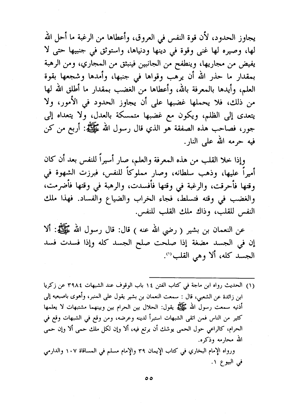 عَن النُّعْمَان بن بشير رَضِي الله عَنهُ قَالَ قَالَ رَسُول الله صلى الله عَلَيْهِ وَسلم أَلا إِن فِي الْجَسَد مُضْغَة إِذا صلحت صلح الْجَسَد كُله وَإِذا فَسدتْ فسد الْجَسَد كُله أَلا وَهِي الْقلب
