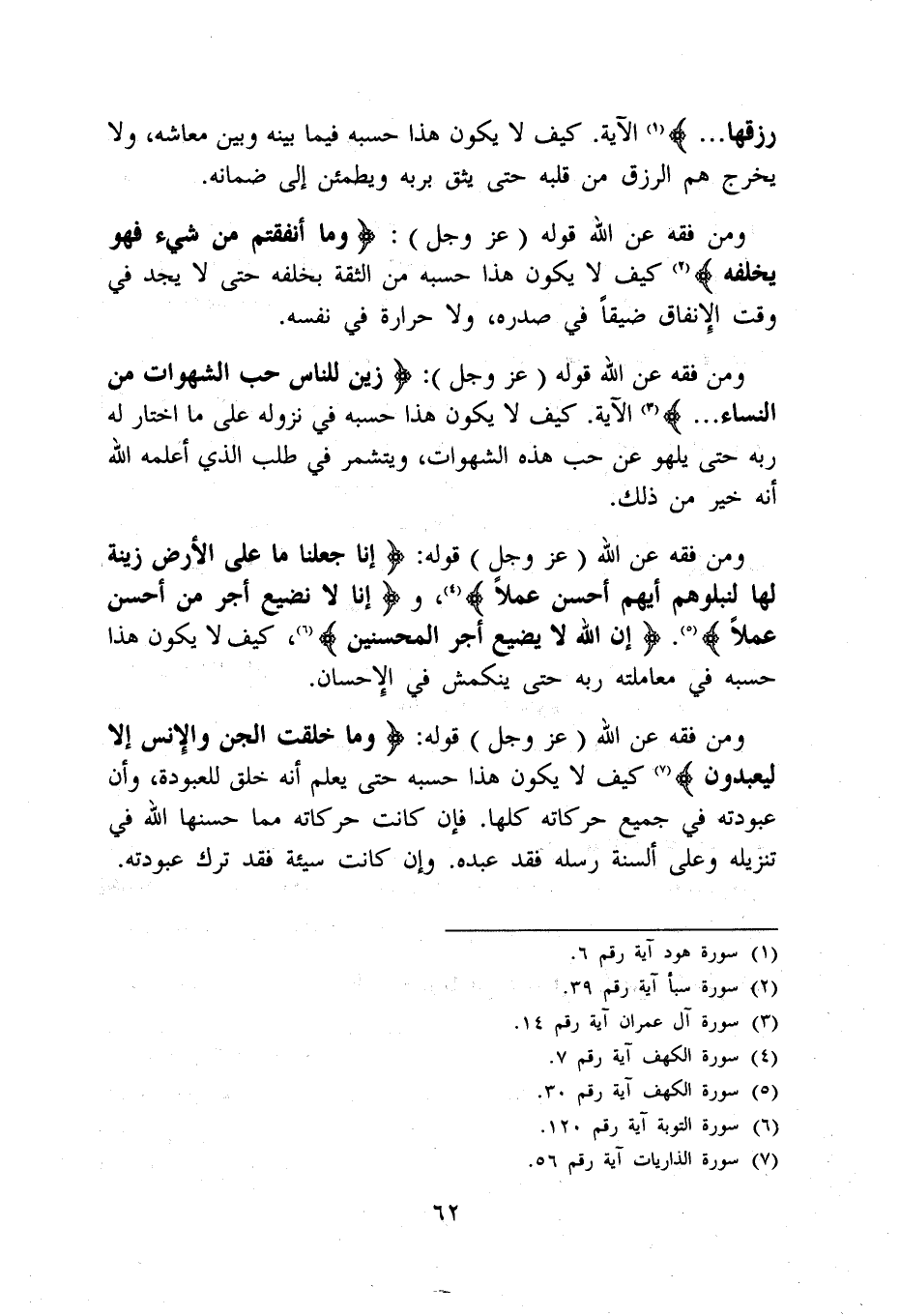 وَمن فقه عَن الله عز وَجل قَوْله {إِنَّا جعلنَا مَا على الأَرْض زِينَة لَهَا لنبلوهم أَيهمْ أحسن عملا} و {إِنَّا لَا نضيع أجر من أحسن عملا} {إِن الله لَا يضيع أجر الْمُحْسِنِينَ} كَيفَ لَا يكون هَذَا حَسبه فِي مُعَامَلَته ربه حَتَّى ينكمش فِي الْإِحْسَان