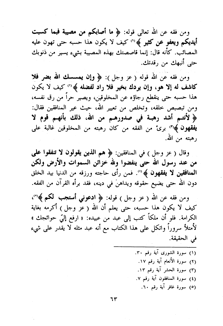 وَقَالَ عز وَجل فِي الْمُنَافِقين {هم الَّذين يَقُولُونَ لَا تنفقوا على من عِنْد رَسُول الله حَتَّى يَنْفضوا وَللَّه خَزَائِن السَّمَاوَات وَالْأَرْض وَلَكِن الْمُنَافِقين لَا يفقهُونَ} فَمن رأى حَاجته ورزقه من الدُّنْيَا بيد الْخلق دون الله حَتَّى يضيع حُقُوقه ويداهن فِي دينه فقد برأه الْقُرْآن من الْفِقْه