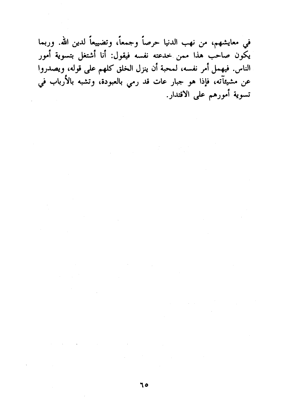 فِي مَعَايشهمْ من نهب الدُّنْيَا حرصا وجمعا وتضييعا لدين الله وَرُبمَا يكون صَاحب هَذَا مِمَّن خدعته نَفسه فَيَقُول أَنا أشتغل بتسوية أُمُور النَّاس فيهمل أَمر نَفسه لمحبة أَن ينزل الْخلق كلهم على قَوْله ويصدروا عَن مشيئآته فَإِذا هُوَ جَبَّار عَاتٍ قد رمي بالعبودة وتشبه بالأرباب فِي تَسْوِيَة أُمُورهم على الاقتدار