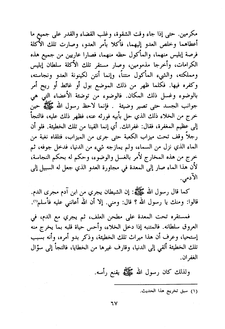 مكرمين حَتَّى إِذا جَاءَ وَقت الشقوة وَغلب الْقَضَاء وَالْقدر على جَمِيع مَا أعطاهما وخلص الْعَدو إِلَيْهِمَا فأكلا بِأَمْر الْعَدو وَصَارَت تِلْكَ الْأكلَة فرْصَة إِبْلِيس مِنْهُمَا والمأكول حَظه مِنْهُمَا فصارا عاريين من جَمِيع هَذِه الكرامات وَأَخْرَجَا مذمومين وَصَارَ مُسْتَقر تِلْكَ الْأكلَة سُلْطَان إِبْلِيس ومملكته وَالشَّيْء الْمَأْكُول منتنا وَإِنَّمَا أنتن لكينونة الْعَدو ونجاسته وكفره فِيهَا فَكلما ظهر من ذَلِك الْموضع بَوْل أَو غَائِط أَو ريح أَمر بِالْوضُوءِ وَغسل ذَلِك الْمَكَان فالوضوء من توضئة الْأَعْضَاء الَّتِي هِيَ جَوَانِب الْجَسَد حَتَّى تصير وضيئة فَإِنَّمَا لاحظ رَسُول الله صلى الله عَلَيْهِ وَسلم حِين خرج من الْخَلَاء ذَلِك الَّذِي حل بِأَبِيهِ فورثه عَنهُ فَظهر ذَلِك عَلَيْهِ فالتجأ إِلَى عَظِيم الْمَغْفِرَة فَقَالَ غفرانك أَي إِنَّمَا القينا من تِلْكَ الْخَطِيئَة فَلَو أَن رجلا وقف تَحت ميزاب الْكَعْبَة حَتَّى جرى من الْمِيزَاب فَتَلقاهُ نغبة من المَاء الَّذِي نزل من السَّمَاء وَلم يمازجه شَيْء من الدُّنْيَا فَدخل جَوْفه ثمَّ خرج من هَذِه المخارج لأمر بِالْغسْلِ وَالْوُضُوء وَحكم لَهُ بِحكم النَّجَاسَة لِأَن هَذَا المَاء صَار إِلَى الْمعدة فِي مجاورة الْعَدو الَّذِي جعل لَهُ السَّبِيل إِلَى الْآدَمِيّ