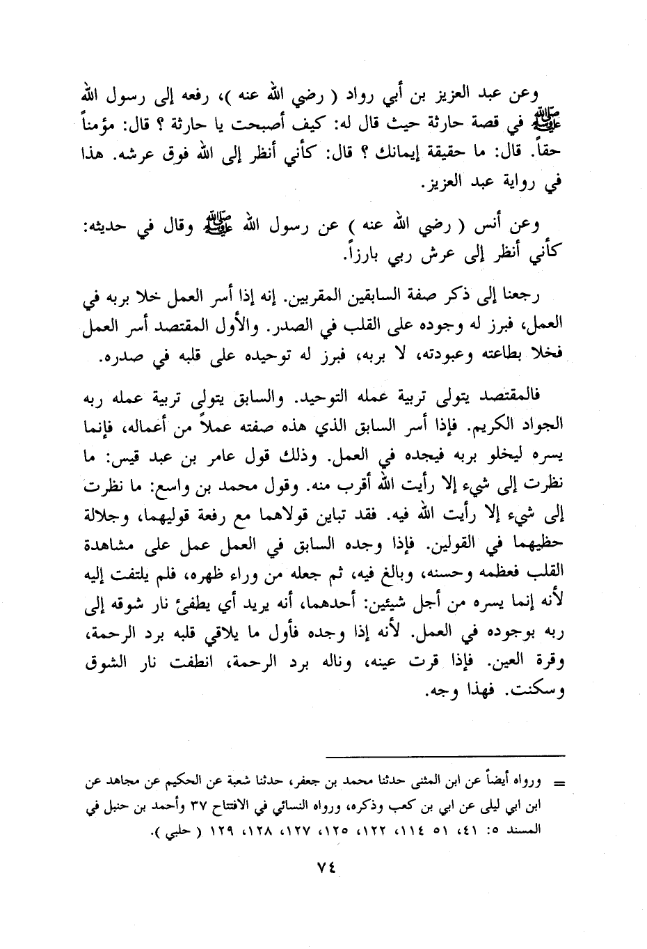 وَعَن عبد الْعَزِيز بن أبي رواد رَضِي الله عَنهُ رَفعه إِلَى رَسُول الله صلى الله عَلَيْهِ وَسلم فِي قصَّة حَارِثَة حَيْثُ قَالَ لَهُ كَيفَ أَصبَحت يَا حَارِثَة قَالَ مُؤمنا حَقًا قَالَ مَا حَقِيقَة إيمانك قَالَ كَأَنِّي أنظر إِلَى الله فَوق عَرْشه هَذَا فِي رِوَايَة عبد الْعَزِيز