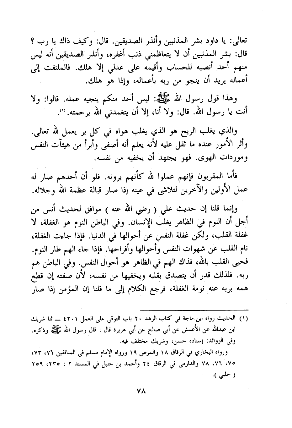 تَعَالَى يَا دَاوُد بشر المذنبين وأنذر الصديقين قَالَ وَكَيف ذَاك يَا رب قَالَ بشر المذنبين أَن لَا يتعاظمني ذَنْب أغفره وأنذر الصديقين أَنه لَيْسَ مِنْهُم أحد أنصبه لِلْحسابِ وأقيمه على عدلي إِلَّا هلك فالملتفت إِلَى أَعماله يُرِيد أَن ينجو من ربه بِأَعْمَالِهِ وَإِذا هُوَ هلك