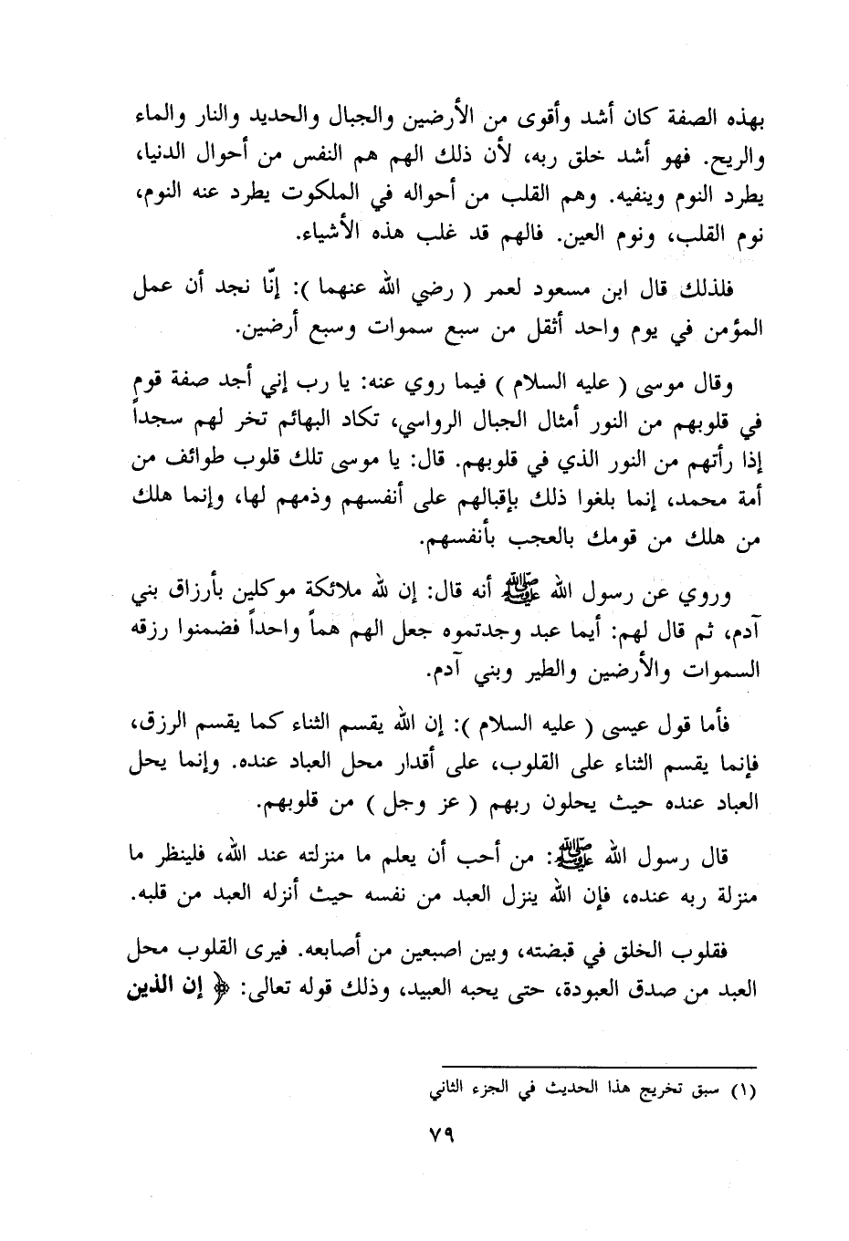 وَقَالَ مُوسَى عَلَيْهِ السَّلَام فِيمَا رُوِيَ عَنهُ يَا رب إِنِّي أجد صفة قوم فِي قُلُوبهم من النُّور أَمْثَال الْجبَال الرواسِي تكَاد الْبَهَائِم تَخِر لَهُم سجدا إِذا رأتهم من النُّور الَّذِي فِي قُلُوبهم قَالَ يَا مُوسَى تِلْكَ قُلُوب طوائف من أمة مُحَمَّد إِنَّمَا بلغُوا ذَلِك بِإِقْبَالِهِمْ على أنفسهم وذمهم لَهَا وَإِنَّمَا هلك من هلك من قَوْمك بالعجب بِأَنْفسِهِم