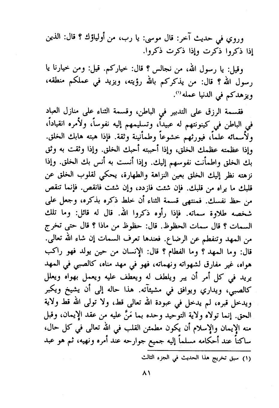 فقسمة الرزق على التَّدْبِير فِي الْبَاطِن وَقِسْمَة الثَّنَاء على منَازِل الْعباد فِي الْبَاطِن فِي كينونتهم لَهُ عبيدا وتسليمهم إِلَيْهِ نفوسا ولأمره انقيادا ولأسمائه علما فيورثهم خشوعا وطمأنينة وثقة فَإِذا هِبته هابك الْخلق وَإِذا عَظمته عظمك الْخلق وَإِذا أحببته أحبك الْخلق وَإِذا وثقت بِهِ وثق بك الْخلق واطمأنت نُفُوسهم إِلَيْك وَإِذا أنست بِهِ أنس بك الْخلق وَإِذا نزهته نظر إِلَيْك الْخلق بِعَين النزاهة وَالطَّهَارَة يَحْكِي لقلوب الْخلق عَن قَلْبك مَا يرَاهُ من قَلْبك فَإِن شِئْت فازدد وَإِن شِئْت فانقص فَإِنَّمَا تنقص من حَظّ نَفسك فمنتهى قسْمَة الثَّنَاء أَن خلط ذكره بِذكرِهِ وَجعل على شخصه طلاوة سماته فَإِذا رَأَوْهُ ذكرُوا الله قَالَ لَهُ قَائِل وَمَا تِلْكَ السمات قَالَ سمات الحظوظ قَالَ حظوظ من مَاذَا قَالَ حَتَّى تخرج من المهد وتنفطم عَن الرَّضَاع فَعندهَا تعرف السمات إِن شَاءَ الله تَعَالَى قَالَ وَمَا المهد وَمَا الْفِطَام قَالَ الْإِنْسَان من حِين يُولد فَهُوَ رَاكب هَوَاهُ غير مفارق لشهواته ونهماته فَهُوَ فِي مهد مناه كَالصَّبِيِّ فِي المهد يُرِيد فِي كل أَمر أَن يبر ويلطف لَهُ ويعطف عَلَيْهِ وَيعْمل بهواه ويعلل كَالصَّبِيِّ ويداري ويوافق فِي شيئآته هَذَا حَاله إِلَى أَن يشيخ وَيكبر وَيدخل فِي عبودة قَبره لم يدْخل الله تَعَالَى قطّ وَلَا تولى الله قطّ ولَايَة الْحق إِنَّمَا تولاه ولَايَة التَّوْحِيد وَحده بِمَا من عَلَيْهِ من عقد الْإِيمَان وَقبل مِنْهُ الْإِيمَان وَالْإِسْلَام أَن يكون مطمئن الْقلب فِي الله تَعَالَى فِي كل حَال سَاكِنا عِنْد أَحْكَامه مُسلما إِلَيْهِ جَمِيع جوارحه عِنْد أمره وَنَهْيه ثمَّ هُوَ عبد