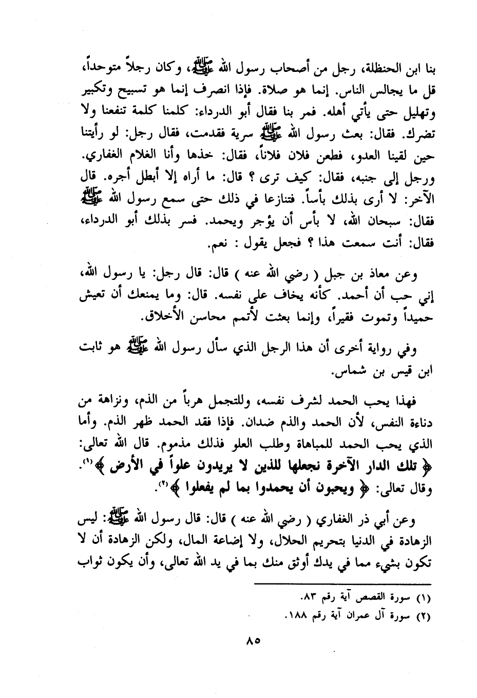 بِنَا ابْن الحنظلة رجل من أَصْحَاب رَسُول الله صلى الله عَلَيْهِ وَسلم وَكَانَ رجلا متوحدا قل مَا يُجَالس النَّاس إِنَّمَا هُوَ صَلَاة فَإِذا انْصَرف إِنَّمَا هُوَ تَسْبِيح وتكبير وتهليل حَتَّى يَأْتِي أَهله فَمر بِنَا فَقَالَ أَبُو الدَّرْدَاء كلمنا كلمة تنفعنا وَلَا تَضُرك فَقَالَ بعث رَسُول الله صلى الله عَلَيْهِ وَسلم سَرِيَّة فَقدمت فَقَالَ رجل لَو رَأَيْتنَا حِين لَقينَا الْعَدو فطعن فلَان فلَانا فَقَالَ خُذْهَا وَأَنا الْغُلَام الْغِفَارِيّ وَرجل إِلَى جنبه فَقَالَ كَيفَ ترى قَالَ مَا أرَاهُ إِلَّا أبطل أجره قَالَ الآخر لَا أرى بذلك بَأْسا فتنازعا فِي ذَلِك حَتَّى سمع رَسُول الله صلى الله عَلَيْهِ وَسلم فَقَالَ سُبْحَانَ الله لَا بَأْس أَن يُؤجر ويحمد فسر بذلك أَبُو الدَّرْدَاء فَقَالَ أَنْت سَمِعت هَذَا فَجعل يَقُول نعم