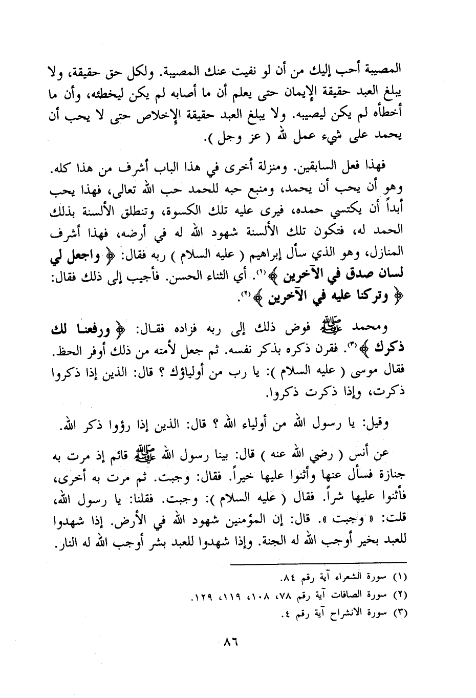 فَهَذَا فعل السَّابِقين ومنزلة أُخْرَى فِي هَذَا الْبَاب أشرف من هَذَا كُله وَهُوَ أَن يحب أَن يحمد ومنبع حبه للحمد حب الله تَعَالَى فَهَذَا يحب أبدا أَن يكتسي حَمده فَيرى عَلَيْهِ تِلْكَ الْكسْوَة وتنطلق الْأَلْسِنَة بذلك الْحَمد لَهُ فَتكون تِلْكَ الْأَلْسِنَة شُهُود الله لَهُ فِي أرضه فَهَذَا أشرف الْمنَازل وَهُوَ الَّذِي سَأَلَ إِبْرَاهِيم عَلَيْهِ السَّلَام ربه فَقَالَ {وَاجعَل لي لِسَان صدق فِي الآخرين} أَي الثَّنَاء الْحسن فَأُجِيب إِلَى ذَلِك فَقَالَ {وَتَركنَا عَلَيْهِ فِي الآخرين}
