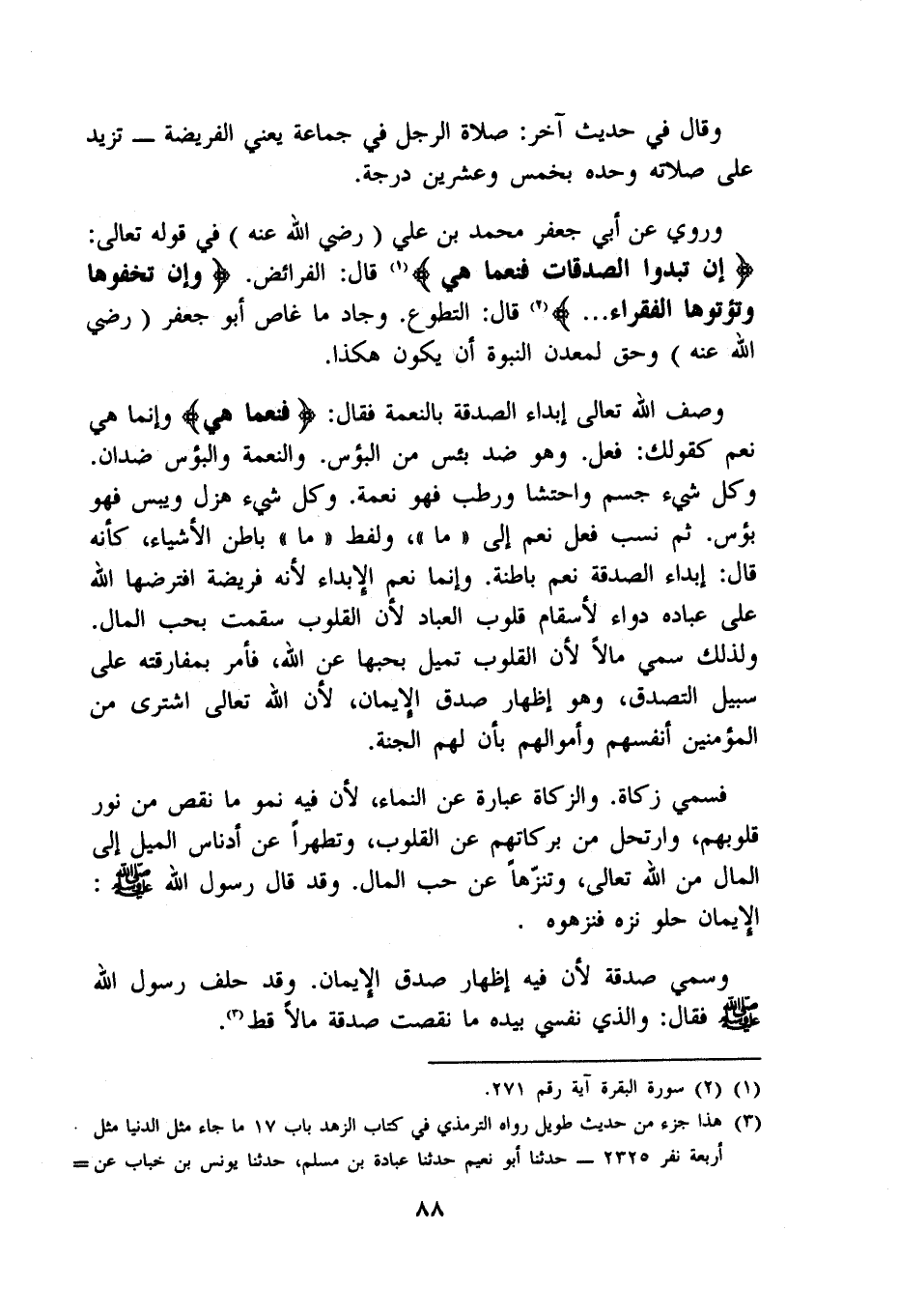 وَرُوِيَ عَن أبي جَعْفَر مُحَمَّد بن عَليّ رَضِي الله عَنهُ فِي قَوْله تَعَالَى {إِن تبدوا الصَّدقَات فَنعما هِيَ} قَالَ الْفَرَائِض {وَإِن تخفوها وتؤتوها الْفُقَرَاء} قَالَ التَّطَوُّع وجاد مَا غاص أَبُو جَعْفَر رَضِي الله عَنهُ وَحقّ لمعدن النُّبُوَّة أَن يكون هَكَذَا