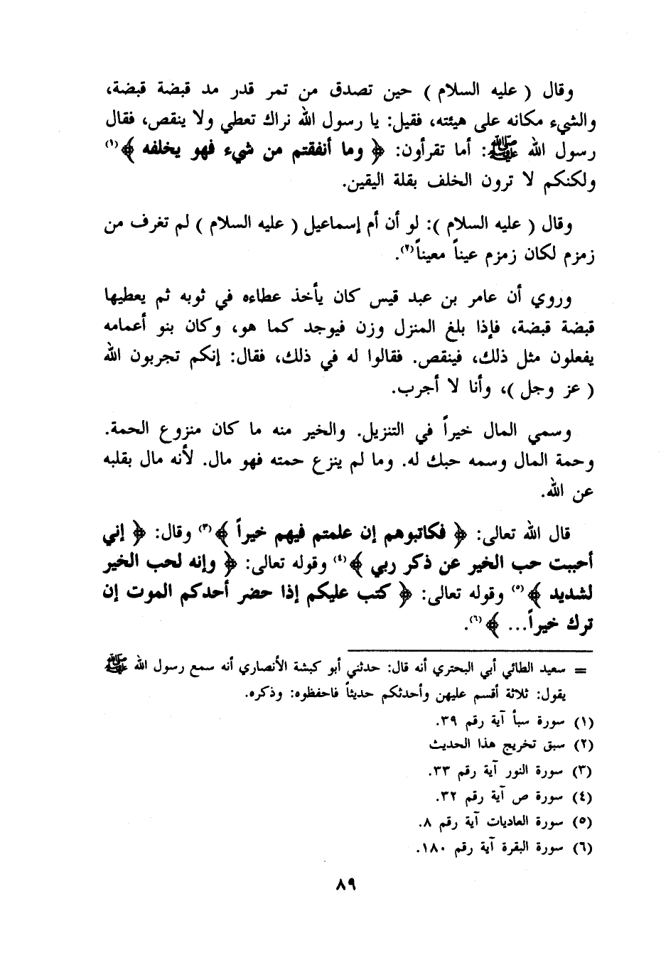 وَقَالَ عَلَيْهِ السَّلَام حِين تصدق من تمر قدر مد قَبْضَة قَبْضَة وَالشَّيْء مَكَانَهُ على هَيئته فَقيل يَا رَسُول الله نرَاك تُعْطِي وَلَا ينقص فَقَالَ رَسُول الله صلى الله عَلَيْهِ وَسلم أما تقرأون وَمَا أنفقتم من شَيْء فَهُوَ يخلفه وَلَكِنَّكُمْ لَا ترَوْنَ الْخلف بقلة الْيَقِين
