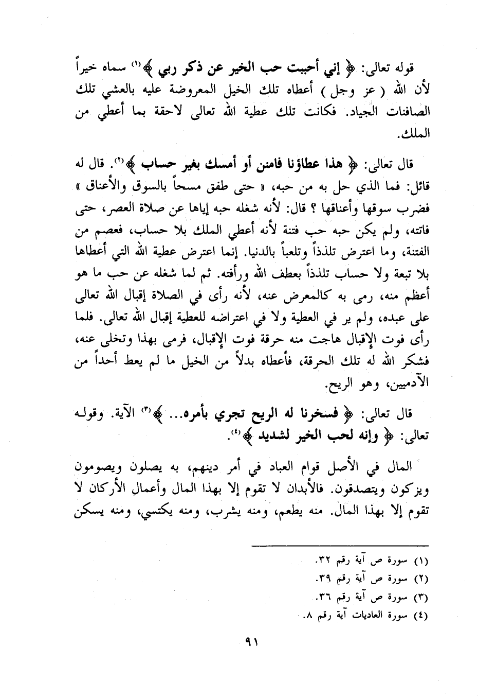 قَالَ تَعَالَى {هَذَا عطاؤنا فَامْنُنْ أَو أمسك بِغَيْر حِسَاب} قَالَ لَهُ قَائِل فَمَا الَّذِي حل بِهِ من حبه حَتَّى طفق مسحا بِالسوقِ والأعناق فَضرب سوقها وأعناقها قَالَ لِأَنَّهُ شغله حبه إِيَّاهَا عَن صَلَاة الْعَصْر حَتَّى فَاتَتْهُ وَلم يكن حبه حب فتْنَة لِأَنَّهُ أعطي الْملك بِلَا حِسَاب فعصم من الْفِتْنَة وَمَا اعْترض تلذذا إِنَّمَا اعْترض عَطِيَّة الله الَّتِي أَعْطَاهَا بِلَا تبعة وَلَا حِسَاب تلذذا بعطف الله ورأفته ثمَّ لما شغله عَن حب مَا هُوَ أعظم مِنْهُ رمى بِهِ كالمعرض عَنهُ لِأَنَّهُ رأى فِي الصَّلَاة إقبال الله تَعَالَى على عَبده وَلم ير فِي الْعَطِيَّة وَلَا فِي اعتراضه للعطية إقبال الله تَعَالَى فَلَمَّا رأى فَوت الإقبال هَاجَتْ مِنْهُ حرقة فَوت الإقبال فَرمى بِهَذَا وتخلى عَنهُ فَشكر الله لَهُ تِلْكَ الحرقة فَأعْطَاهُ بَدَلا من الْخَيل مَا لم يُعْط أحدا من الْآدَمِيّين وَهُوَ الرّيح