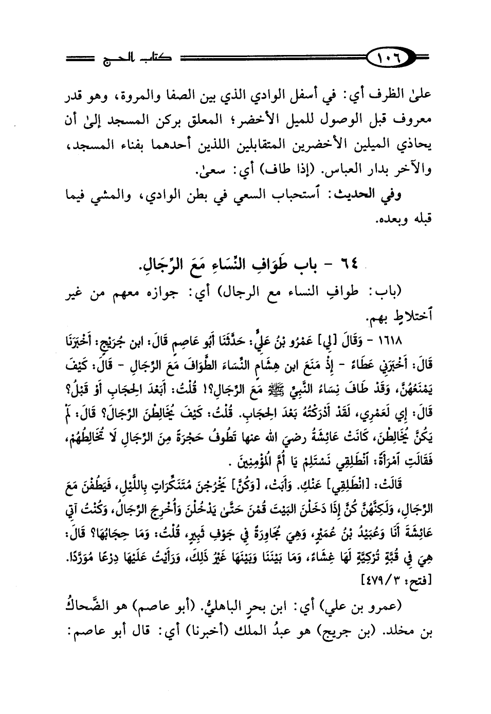 1618 - وقَال [لِي] عَمْرُو بْنُ عَلِيٍّ: حَدَّثَنَا أَبُو عَاصِمٍ، قَال: ابْنُ جُرَيْجٍ، أَخْبَرَنَا قَال: أَخْبَرَنِي عَطَاءٌ: إِذْ مَنَعَ ابْنُ هِشَامٍ النِّسَاءَ الطَّوَافَ مَعَ الرِّجَالِ، قَال: كَيْفَ يَمْنَعُهُنَّ؟ وَقَدْ طَافَ نِسَاءُ النَّبِيِّ صَلَّى اللهُ عَلَيْهِ وَسَلَّمَ مَعَ الرِّجَالِ؟ قُلْتُ: أَبَعْدَ الحِجَابِ أَوْ قَبْلُ؟ قَال: إِي لَعَمْرِي، لَقَدْ أَدْرَكْتُهُ بَعْدَ الحِجَابِ، قُلْتُ: كَيْفَ يُخَالِطْنَ الرِّجَال؟ قَال: لَمْ يَكُنَّ يُخَالِطْنَ، كَانَتْ عَائِشَةُ رَضِيَ اللَّهُ عَنْهَا تَطُوفُ حَجْرَةً مِنَ الرِّجَالِ، لَا تُخَالِطُهُمْ، فَقَالتْ امْرَأَةٌ: انْطَلِقِي نَسْتَلِمْ يَا أُمَّ المُؤْمِنِينَ، قَالتْ: " [انْطَلِقِي] عَنْكِ"، وَأَبَتْ، يَخْرُجْنَ مُتَنَكِّرَاتٍ بِاللَّيْلِ، فَيَطُفْنَ مَعَ الرِّجَالِ، وَلَكِنَّهُنَّ كُنَّ إِذَا دَخَلْنَ البَيْتَ، قُمْنَ حَتَّى يَدْخُلْنَ، وَأُخْرِجَ الرِّجَالُ، وَكُنْتُ آتِي عَائِشَةَ أَنَا وَعُبَيْدُ بْنُ عُمَيْرٍ، وَهِيَ مُجَاورَةٌ فِي جَوْفِ ثَبِيرٍ، قُلْتُ: وَمَا حِجَابُهَا؟ قَال: هِيَ فِي قُبَّةٍ تُرْكِيَّةٍ، لَهَا غِشَاءٌ، وَمَا بَيْنَنَا وَبَيْنَهَا غَيْرُ ذَلِكَ، وَرَأَيْتُ عَلَيْهَا دِرْعًا مُوَرَّدًا.