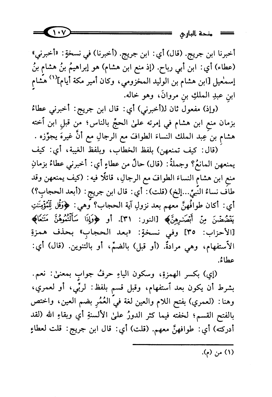 (قال: كيف تمنعهن) بلفظ الخطاب، وبلفظ الغيبة، أي: كيف يمنعهن المانعُ؛ وجملةُ: (قال) حالٌ من عطاء أي: أخبرني عطاءُ بزمانِ منعِ ابن هشامٍ النساءَ الطوافَ مع الرجالِ، قائلًا فيه: (كيف يمنعهن وقد طاف نساءُ النَّبيِّ ... إلخ) (قلت): أي: قال ابن جريج: (أبعد الحجابِ؟) أي: أكان طوافُهنَّ معهم بعد نزولِ آية الحجاب؟ وهي: {وَقُلْ لِلْمُؤْمِنَاتِ يَغْضُضْنَ مِنْ أَبْصَارِهِنَّ} [النور: 31]. أو {وَإِذَا سَأَلْتُمُوهُنَّ مَتَاعًا} [الأحزاب: 53] وفي نسخةٍ: "بعد الحجابِ" بحذف همزةِ الاستفهام، وهي مرادةٌ. (أو قبل) بالضمِّ، أو بالتنوين. (قال) أي: عطاءٌ.