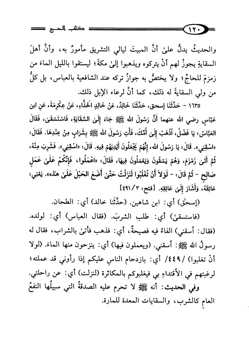 1635 - حَدَّثَنَا إِسْحَاقُ، حَدَّثَنَا خَالِدٌ، عَنْ خَالِدٍ الحَذَّاءِ، عَنْ عِكْرِمَةَ، عَنِ ابْنِ عَبَّاسٍ رَضِيَ اللَّهُ عَنْهُمَا: أَنَّ رَسُولَ اللَّهِ صَلَّى اللهُ عَلَيْهِ وَسَلَّمَ جَاءَ إِلَى السِّقَايَةِ فَاسْتَسْقَى، فَقَال العَبَّاسُ: يَا فَضْلُ، اذْهَبْ إِلَى أُمِّكَ فَأْتِ رَسُولَ اللَّهِ صَلَّى اللهُ عَلَيْهِ وَسَلَّمَ بِشَرَابٍ مِنْ عِنْدِهَا، فَقَال: "اسْقِنِي"، قَال: يَا رَسُولَ اللَّهِ، إِنَّهُمْ يَجْعَلُونَ أَيْدِيَهُمْ فِيهِ، قَال: "اسْقِنِي"، فَشَرِبَ مِنْهُ، ثُمَّ أَتَى زَمْزَمَ وَهُمْ يَسْقُونَ وَيَعْمَلُونَ فِيهَا، فَقَال: "اعْمَلُوا فَإِنَّكُمْ عَلَى عَمَلٍ صَالِحٍ" ثُمَّ قَال: "لَوْلَا أَنْ تُغْلَبُوا لَنَزَلْتُ، حَتَّى أَضَعَ الحَبْلَ عَلَى هَذِهِ" يَعْنِي: عَاتِقَهُ، وَأَشَارَ إِلَى عَاتِقِهِ.