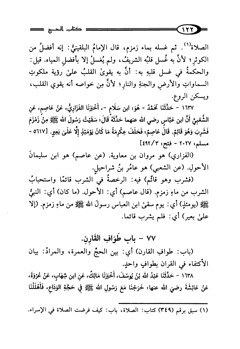 1637 - حَدَّثَنَا مُحَمَّدٌ هُوَ ابْنُ سَلامٍ، أَخْبَرَنَا الفَزَارِيُّ، عَنْ عَاصِمٍ، عَنِ الشَّعْبِيِّ، أَنَّ ابْنَ عَبَّاسٍ رَضِيَ اللَّهُ عَنْهُمَا حَدَّثَهُ قَال: "سَقَيْتُ رَسُولَ اللَّهِ صَلَّى اللهُ عَلَيْهِ وَسَلَّمَ مِنْ زَمْزَمَ، فَشَرِبَ وَهُوَ قَائِمٌ" قَال عَاصِمٌ: فَحَلَفَ عِكْرِمَةُ مَا كَانَ يَوْمَئِذٍ إلا عَلَى بَعِيرٍ.