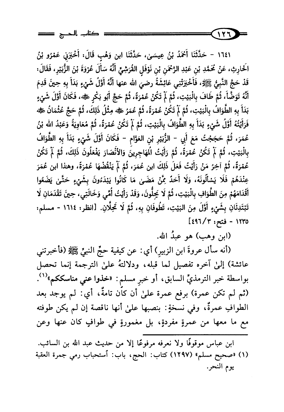 1641 - حَدَّثَنَا أَحْمَدُ بْنُ عِيسَى، حَدَّثَنَا ابْنُ وَهْبٍ قَال: أَخْبَرَنِي عَمْرُو بْنُ الحَارِثِ، عَنْ مُحَمَّدِ بْنِ عَبْدِ الرَّحْمَنِ بْنِ نَوْفَلٍ القُرَشِيِّ، أَنَّهُ سَأَلَ عُرْوَةَ بْنَ الزُّبَيْرِ فَقَال: قَدْ حَجَّ النَّبِيُّ صَلَّى اللهُ عَلَيْهِ وَسَلَّمَ، فَأَخْبَرَتْنِي عَائِشَةُ رَضِيَ اللَّهُ عَنْهَا: "أَنَّهُ أَوَّلُ شَيْءٍ بَدَأَ بِهِ حِينَ قَدِمَ أَنَّهُ تَوَضَّأَ، ثُمَّ طَافَ بِالْبَيْتِ، ثُمَّ لَمْ تَكُنْ عُمْرَةً" ثُمَّ حَجَّ أَبُو بَكْرٍ رَضِيَ اللَّهُ عَنْهُ فَكَانَ أَوَّلَ شَيْءٍ بَدَأَ بِهِ الطَّوَافُ بِالْبَيْتِ، ثُمَّ لَمْ تَكُنْ عُمْرَةً ثُمَّ عُمَرُ رَضِيَ اللَّهُ عَنْهُ مِثْلُ ذَلِكَ ثُمَّ حَجَّ عُثْمَانُ رَضِيَ اللَّهُ عَنْهُ، فَرَأَيْتُهُ أَوَّلُ شَيْءٍ بَدَأَ بِهِ الطَّوَافُ بِالْبَيْتِ ثُمَّ لَمْ تَكُنْ عُمْرَةً ثُمَّ مُعَاويَةُ، وَعَبْدُ اللَّهِ بْنُ عُمَرَ، ثُمَّ حَجَجْتُ مَعَ أَبِي الزُّبَيْرِ بْنِ العَوَّامِ فَكَانَ أَوَّلَ شَيْءٍ بَدَأَ بِهِ الطَّوَافُ بِالْبَيْتِ، ثُمَّ لَمْ تَكُنْ عُمْرَةً ثُمَّ رَأَيْتُ المُهَاجِرِينَ وَالأَنْصَارَ يَفْعَلُونَ ذَلِكَ، ثُمَّ لَمْ تَكُنْ عُمْرَةً، ثُمَّ آخِرُ مَنْ رَأَيْتُ فَعَلَ ذَلِكَ ابْنُ عُمَرَ، ثُمَّ لَمْ يَنْقُضْهَا عُمْرَةً، وَهَذَا ابْنُ عُمَرَ عِنْدَهُمْ فَلَا يَسْأَلُونَهُ، وَلَا أَحَدٌ مِمَّنْ مَضَى، مَا كَانُوا يَبْدَءُونَ بِشَيْءٍ حَتَّى يَضَعُوا أَقْدَامَهُمْ مِنَ الطَّوَافِ بِالْبَيْتِ، ثُمَّ لَا يَحِلُّونَ وَقَدْ رَأَيْتُ أُمِّي وَخَالتِي حِينَ تَقْدَمَانِ، لَا تَبْتَدِئَانِ بِشَيْءٍ أَوَّلَ مِنَ البَيْتِ، تَطُوفَانِ بِهِ، ثُمَّ إِنَّهُمَا لَا تَحِلَّانِ.