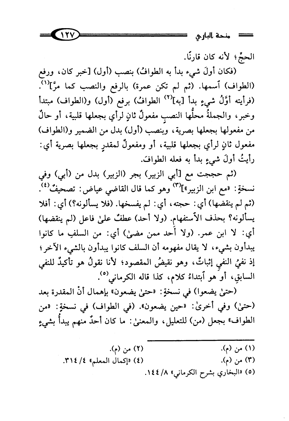 (فكان أولَ شيء بدأ به الطوافُ) بنصب (أول) [خبر كان، ورفع (الطّواف) اسمها. (ثمّ لم تكن عمرة) بالرفع والنصب كما مرَّ] (¬1). (فرأيته أوَّلُ شيءٍ بدأ [به] (¬2) الطوافُ) برفع (أول) و (الطّواف) مبتدأ وخبر، والجملةُ محلُّها النصبِ مفعولٌ ثانٍ لرأي بجعلها قلبية، أو حالٌ من مفعولها بجعلها بصرية، وبنصب (أول) بدل من الضمير و (الطّواف) مفعول ثانٍ لرأي بجعلها قلبية، أو ومفعولٌ لمقدرٍ بجعلها بصرية أي: رأيتُ أولَ شيءٍ بدأ به فعله الطوافَ.