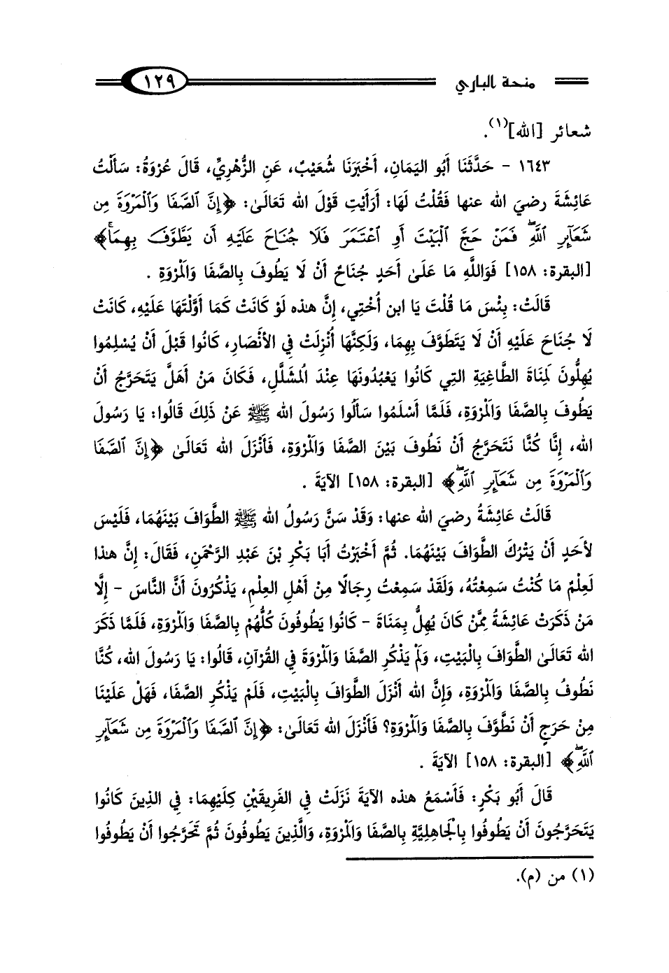 1643 - حَدَّثَنَا أَبُو اليَمَانِ، أَخْبَرَنَا شُعَيْبٌ، عَنِ الزُّهْرِيِّ، قَال عُرْوَةُ: سَأَلْتُ عَائِشَةَ رَضِيَ اللَّهُ عَنْهَا فَقُلْتُ لَهَا: أَرَأَيْتِ قَوْلَ اللَّهِ تَعَالى: {إِنَّ الصَّفَا وَالمَرْوَةَ مِنْ شَعَائِرِ اللَّهِ فَمَنْ حَجَّ البَيْتَ أَو اعْتَمَرَ فَلَا جُنَاحَ عَلَيْهِ أَنْ يَطَّوَّفَ بِهِمَا} [البقرة: 158]، فَوَاللَّهِ مَا عَلَى أَحَدٍ جُنَاحٌ أَنْ لَا يَطُوفَ بِالصَّفَا وَالمَرْوَةِ، قَالتْ: بِئْسَ مَا قُلْتَ يَا ابْنَ أُخْتِي، إِنَّ هَذِهِ لَوْ كَانَتْ كَمَا أَوَّلْتَهَا عَلَيْهِ، كَانَتْ: لَا جُنَاحَ عَلَيْهِ أَنْ لَا يَتَطَوَّفَ بِهِمَا، وَلَكِنَّهَا أُنْزِلَتْ فِي الأَنْصَارِ، كَانُوا قَبْلَ أَنْ يُسْلِمُوا يُهِلُّونَ لِمَنَاةَ الطَّاغِيَةِ، الَّتِي كَانُوا يَعْبُدُونَهَا عِنْدَ المُشَلَّلِ، فَكَانَ مَنْ أَهَلَّ يَتَحَرَّجُ أَنْ يَطُوفَ بِالصَّفَا وَالمَرْوَةِ، فَلَمَّا أَسْلَمُوا، سَأَلُوا رَسُولَ اللَّهِ صَلَّى اللهُ عَلَيْهِ وَسَلَّمَ عَنْ ذَلِكَ، قَالُوا: يَا رَسُولَ اللَّهِ، إِنَّا كُنَّا نَتَحَرَّجُ أَنْ نَطُوفَ بَيْنَ الصَّفَا وَالمَرْوَةِ، فَأَنْزَلَ اللَّهُ تَعَالى: {إِنَّ الصَّفَا وَالمَرْوَةَ مِنْ شَعَائِرِ اللَّهِ} [البقرة: 158]. الآيَةَ قَالتْ عَائِشَةُ رَضِيَ اللَّهُ عَنْهَا: "وَقَدْ سَنَّ رَسُولُ اللَّهِ صَلَّى اللهُ عَلَيْهِ وَسَلَّمَ الطَّوَافَ بَيْنَهُمَا، فَلَيْسَ لِأَحَدٍ أَنْ يَتْرُكَ الطَّوَافَ بَيْنَهُمَا"، ثُمَّ أَخْبَرْتُ أَبَا بَكْرِ بْنَ عَبْدِ الرَّحْمَنِ فَقَال: إِنَّ هَذَا لَعِلْمٌ مَا كُنْتُ سَمِعْتُهُ، وَلَقَدْ سَمِعْتُ رِجَالًا مِنْ أَهْلِ العِلْمِ يَذْكُرُونَ: أَنَّ النَّاسَ، - إلا مَنْ ذَكَرَتْ عَائِشَةُ - مِمَّنْ كَانَ يُهِلُّ بِمَنَاةَ، كَانُوا يَطُوفُونَ كُلُّهُمْ بِالصَّفَا وَالمَرْوَةِ، فَلَمَّا ذَكَرَ اللَّهُ تَعَالى الطَّوَافَ بِالْبَيْتِ، وَلَمْ يَذْكُرِ الصَّفَا وَالمَرْوَةَ فِي القُرْآنِ، قَالُوا: يَا رَسُولَ اللَّهِ، كُنَّا نَطُوفُ بِالصَّفَا وَالمَرْوَةِ وَإِنَّ اللَّهَ أَنْزَلَ الطَّوَافَ بِالْبَيْتِ فَلَمْ يَذْكُرِ الصَّفَا، فَهَلْ عَلَيْنَا مِنْ حَرَجٍ أَنْ نَطَّوَّفَ بِالصَّفَا وَالمَرْوَةِ؟ فَأَنْزَلَ اللَّهُ تَعَالى: {إِنَّ الصَّفَا وَالمَرْوَةَ مِنْ شَعَائِرِ اللَّهِ} [البقرة: 158] الآيَةَ قَال أَبُو بَكْرٍ: "فَأَسْمَعُ هَذِهِ الآيَةَ نَزَلَتْ فِي الفَرِيقَيْنِ كِلَيْهِمَا، فِي الَّذِينَ كَانُوا يَتَحَرَّجُونَ أَنْ يَطُوفُوا بِالْجَاهِلِيَّةِ بِالصَّفَا وَالمَرْوَةِ، وَالَّذِينَ يَطُوفُونَ ثُمَّ تَحَرَّجُوا أَنْ يَطُوفُوا